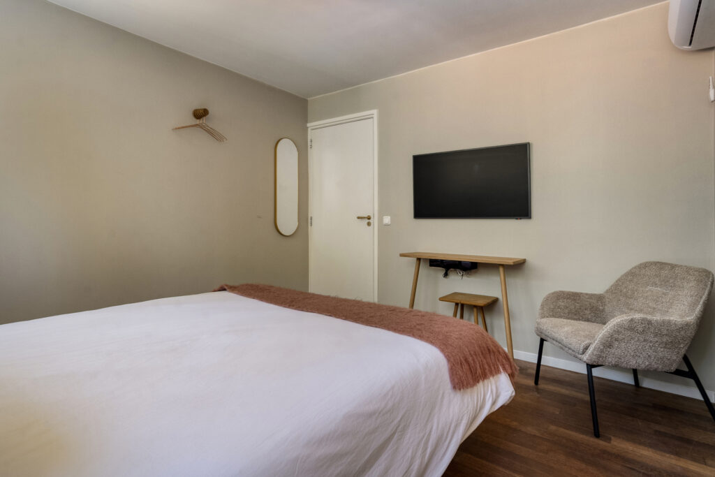 Kamer 2: Slaapkamer met airconditioning, verwarming, televisie, tweepersoonsbed en badkamer voorzien van inloopdouche, toilet en wastafel.