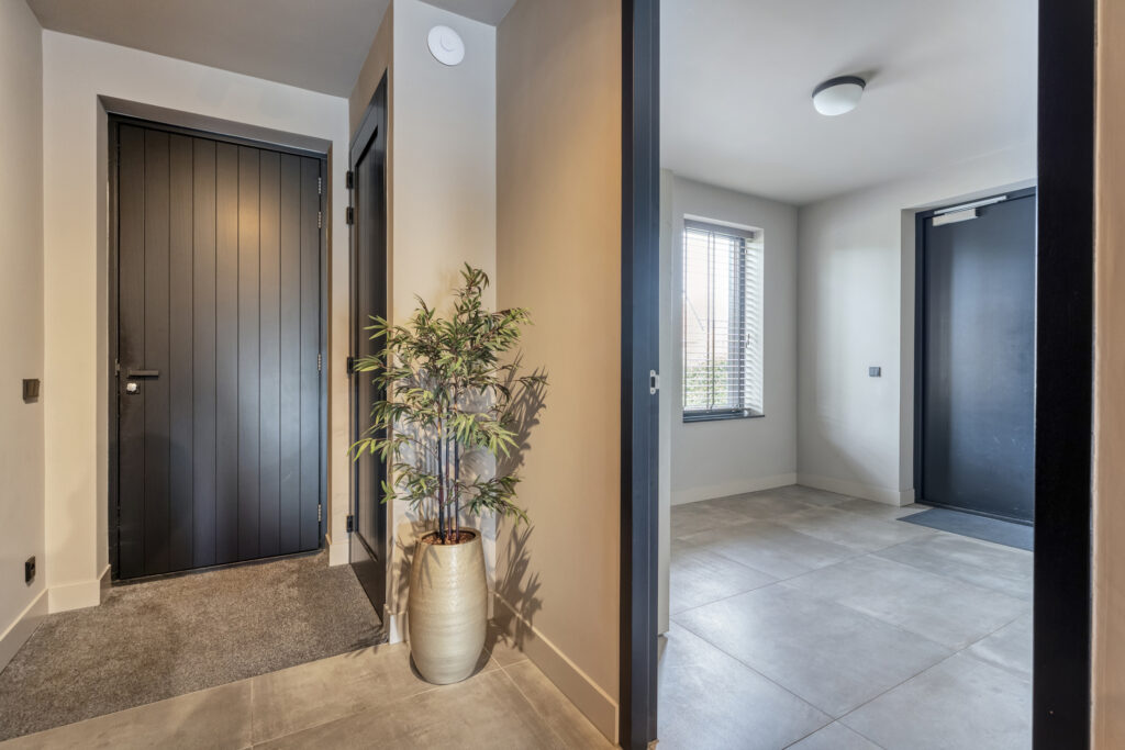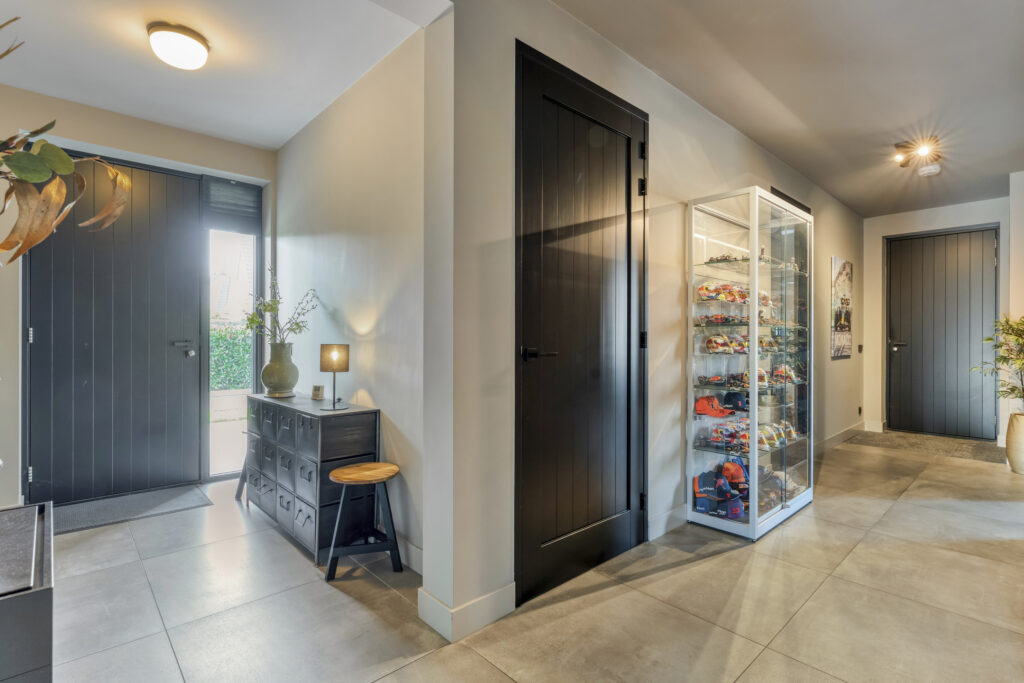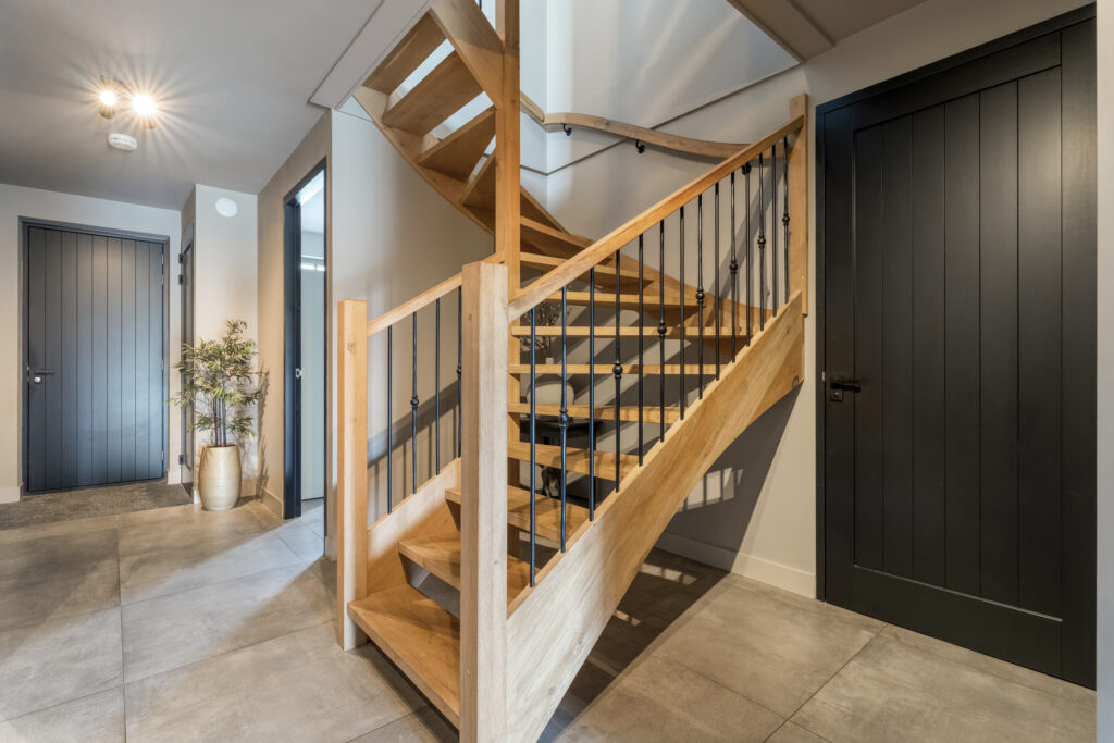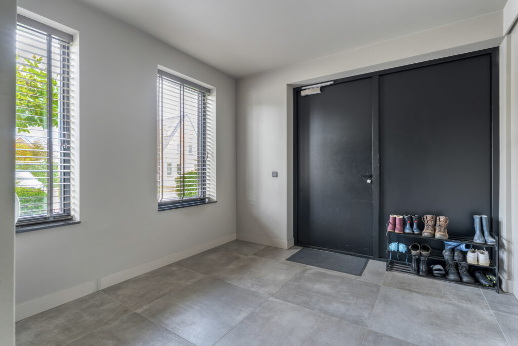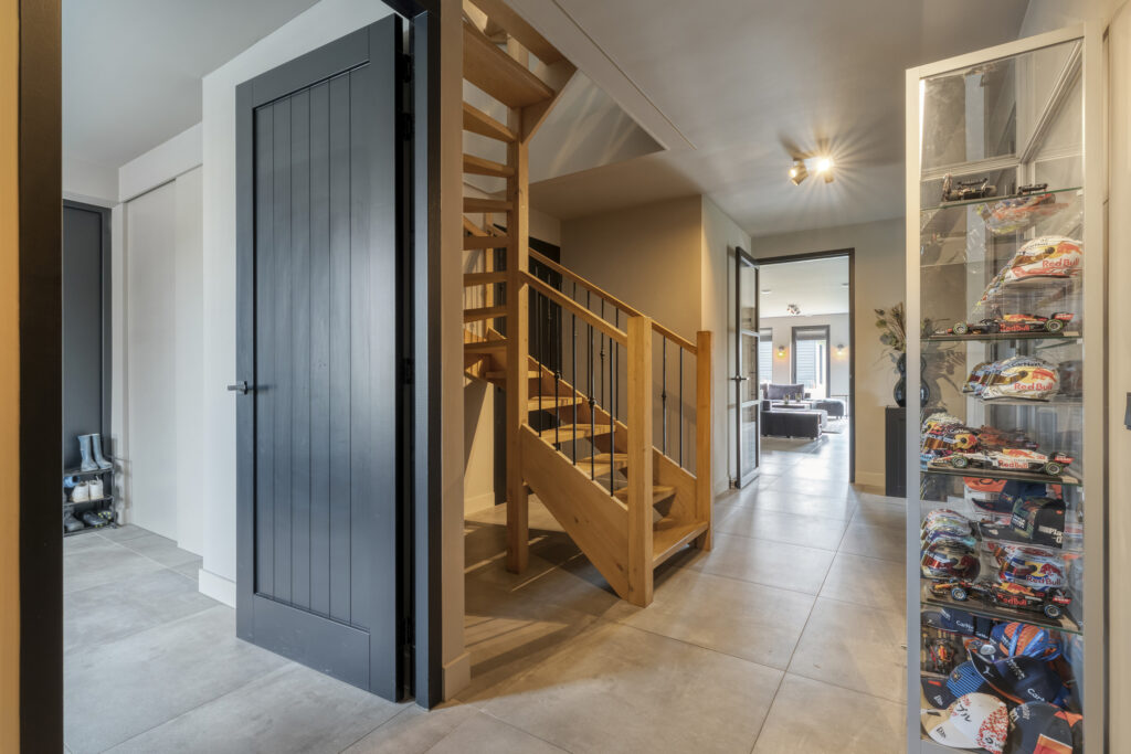 De entree met trapopgang en garderoberuimte vormt het hart van de begane grond. Vanuit hier heb je toegang tot alle vertrekken.