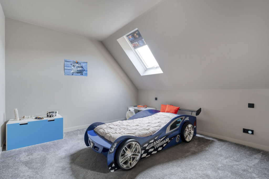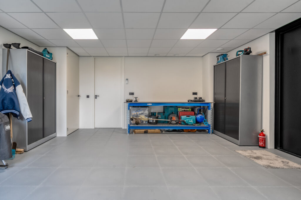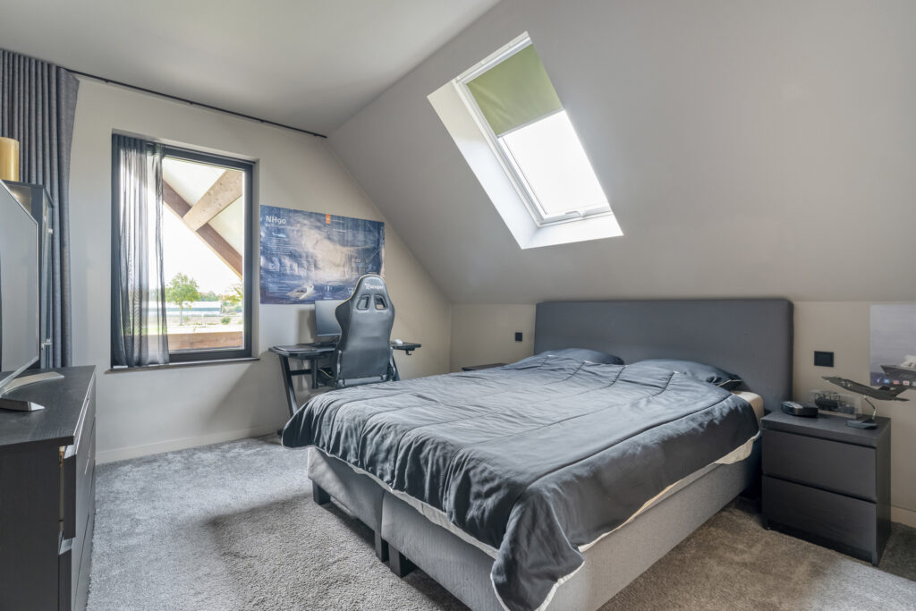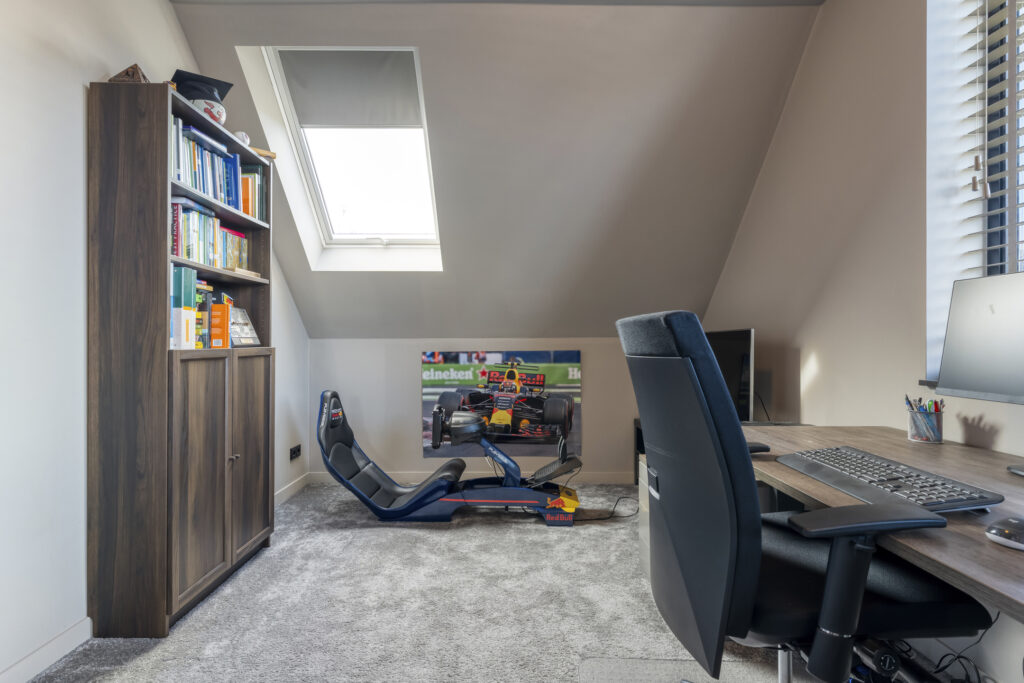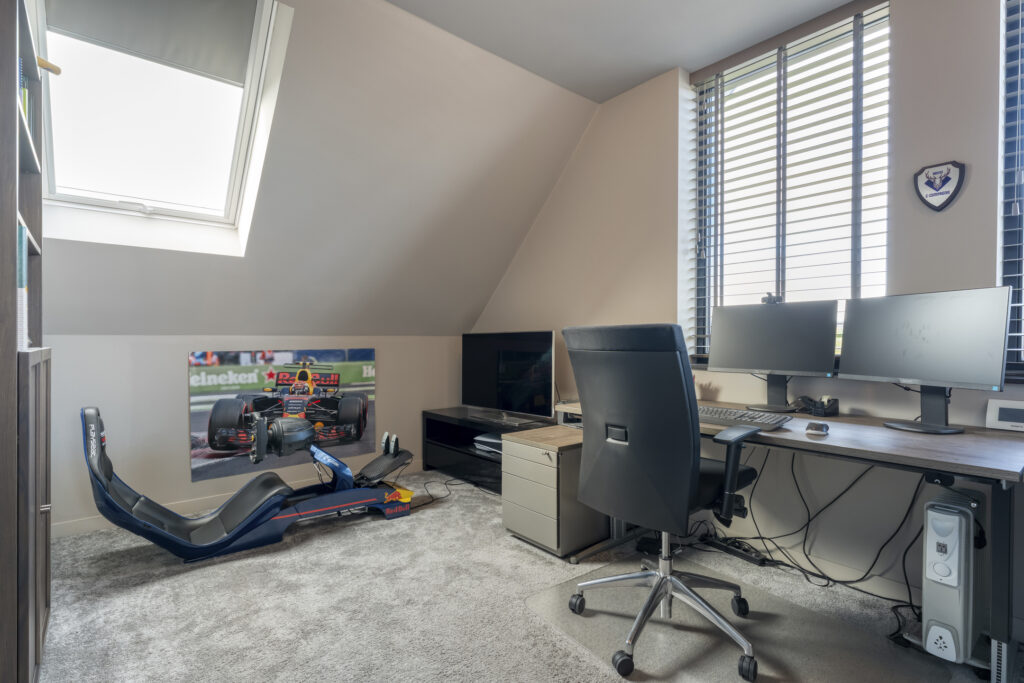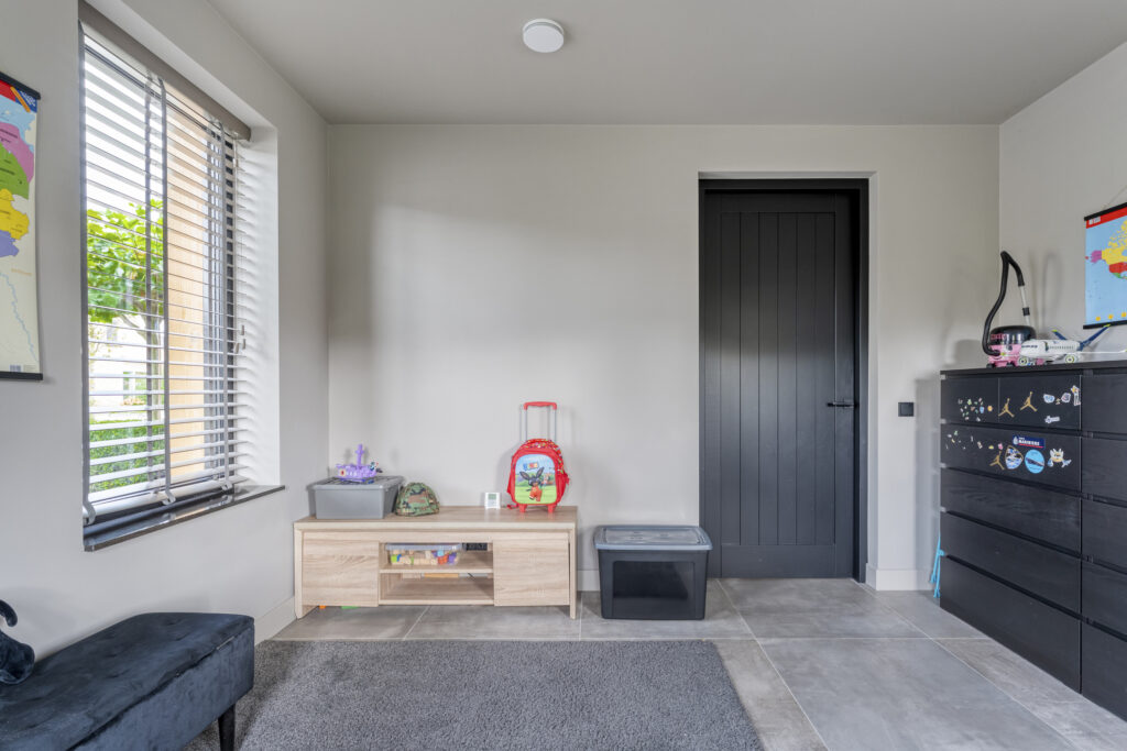 Aan de voorzijde bevindt zich de slaapkamer die nu als speelkamer wordt gebruikt. Ideaal als levensloopbestendige optie of als werkruimte aan huis. Aangrenzend vind je de berging, die via een dubbele deur toegang geeft tot buiten.