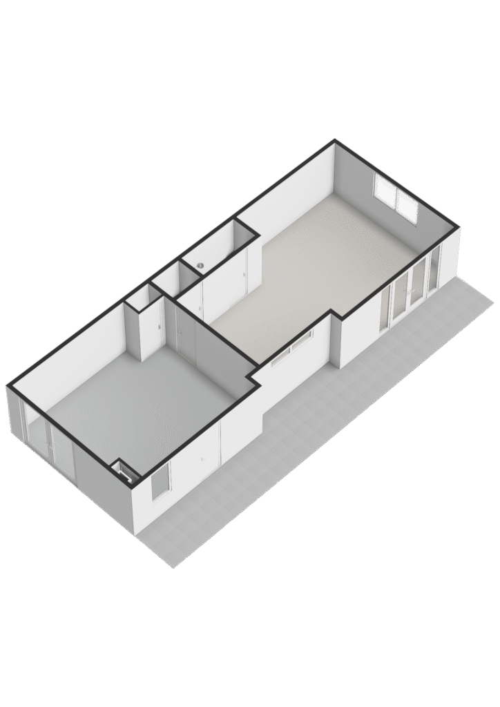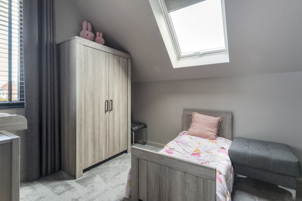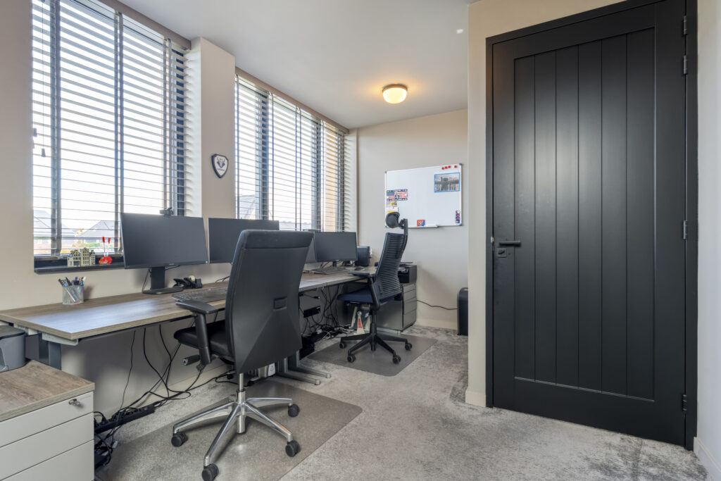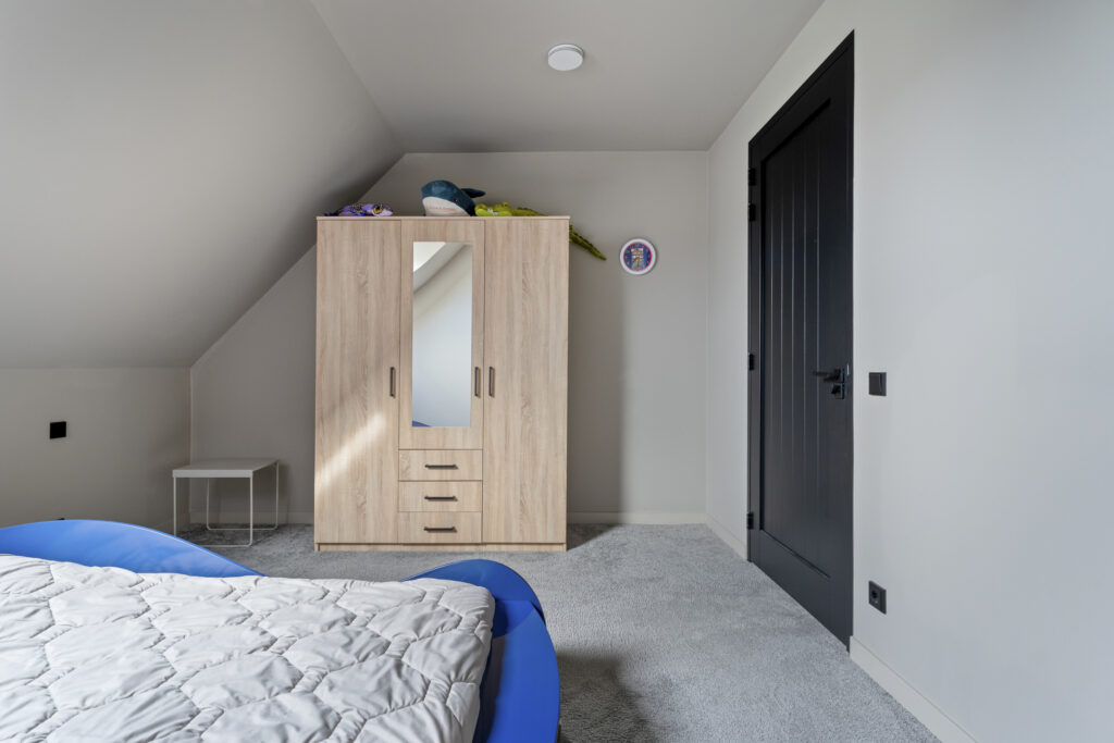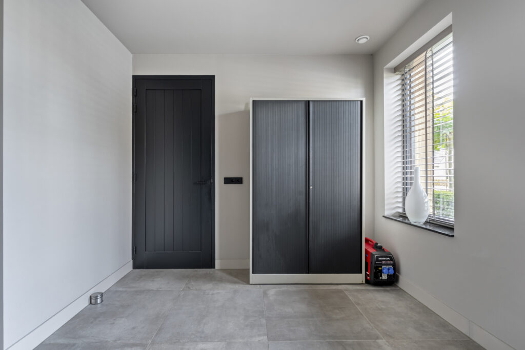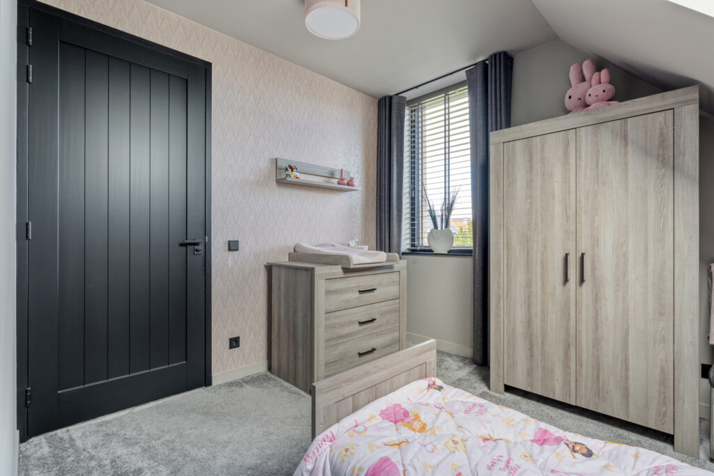 Aan de voorzijde bevindt zich de slaapkamer die nu als speelkamer wordt gebruikt. Ideaal als levensloopbestendige optie of als werkruimte aan huis. Aangrenzend vind je de berging, die via een dubbele deur toegang geeft tot buiten.