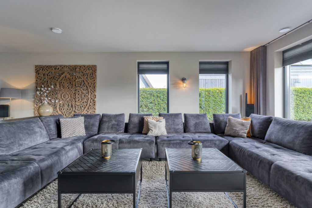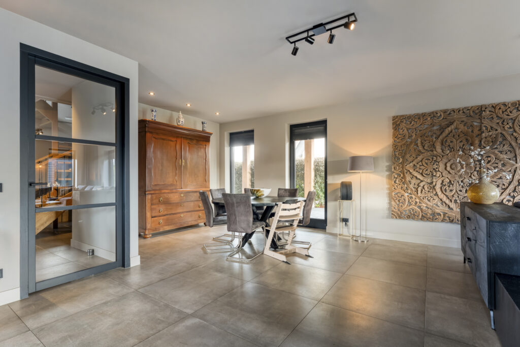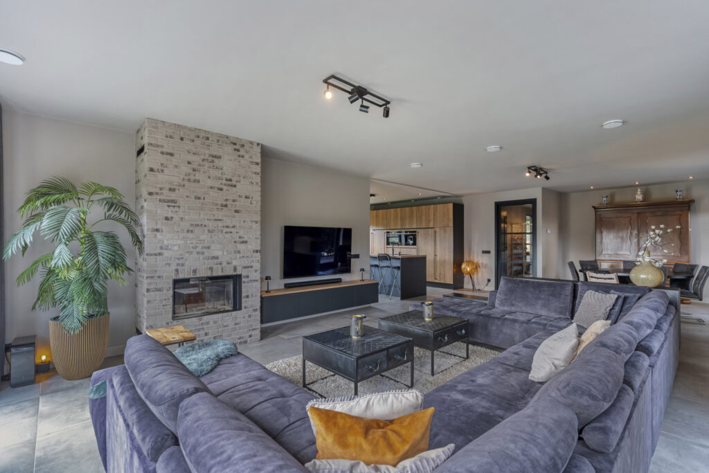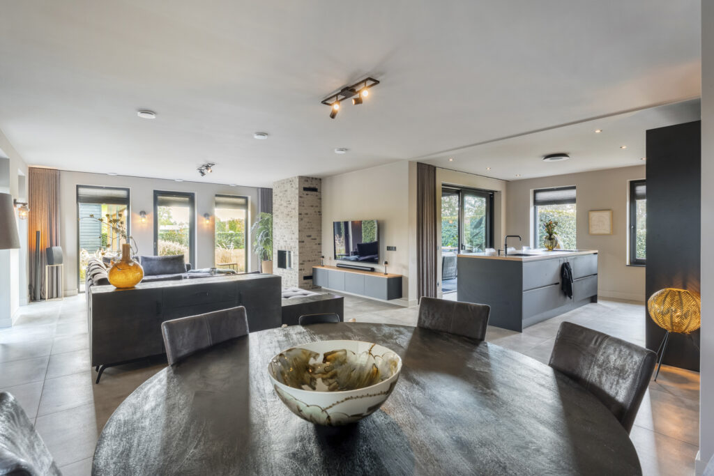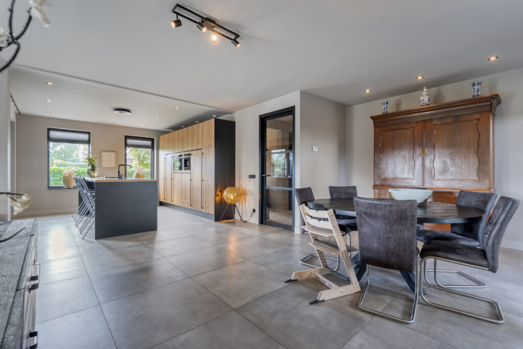 De woonkamer ligt aan de achterzijde en strekt zich over de volle breedte van de woning uit. Grote ramen zorgen voor veel lichtinval en een prachtig uitzicht op de tuin. De woonkamer staat in open verbinding met de eetkamer, waar je met gemak een royale eettafel kwijt kunt.