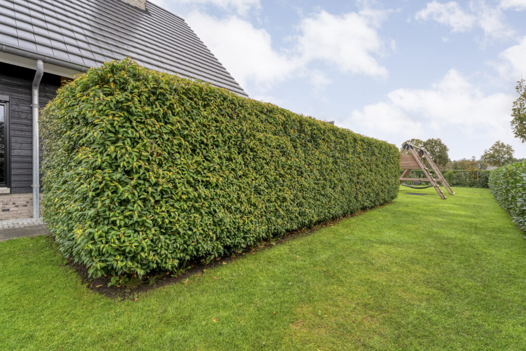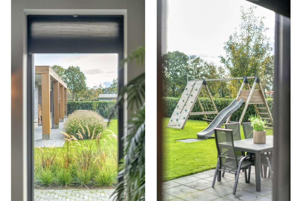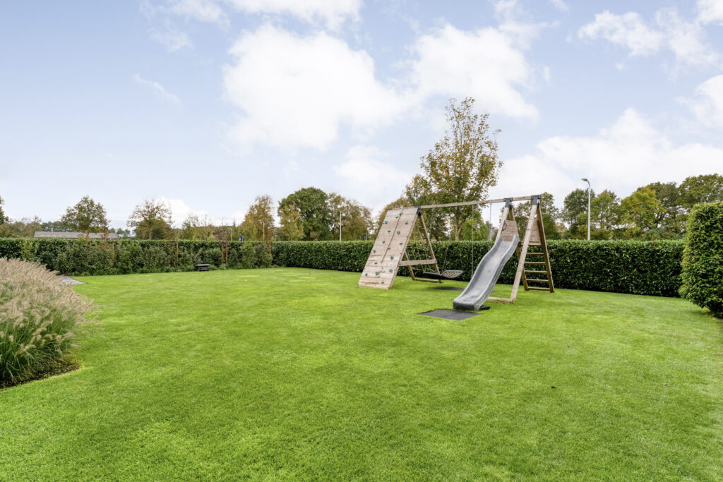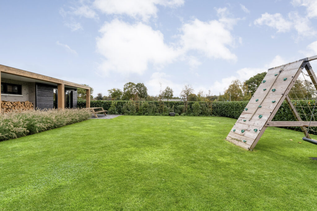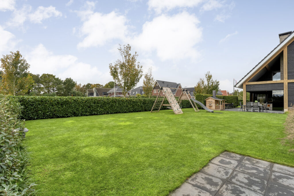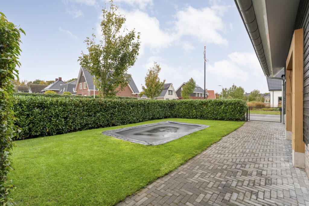 Buiten: De achtertuin is met zorg aangelegd en biedt volop privacy door de groene erfafscheiding. De gehele tuin beschikt over een geheel automatisch beregeningssysteem, gevoed vanuit een eigen bron, met sproeiers voor het gazon en druppelslangen voor borders en hagen.