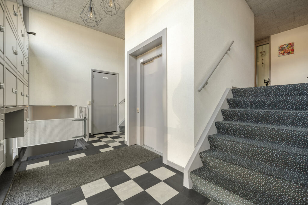 Je bereikt het appartement via de centrale entree met liftinstallatie. Eenmaal binnen kom je in de hal, die toegang geeft tot vrijwel alle vertrekken.