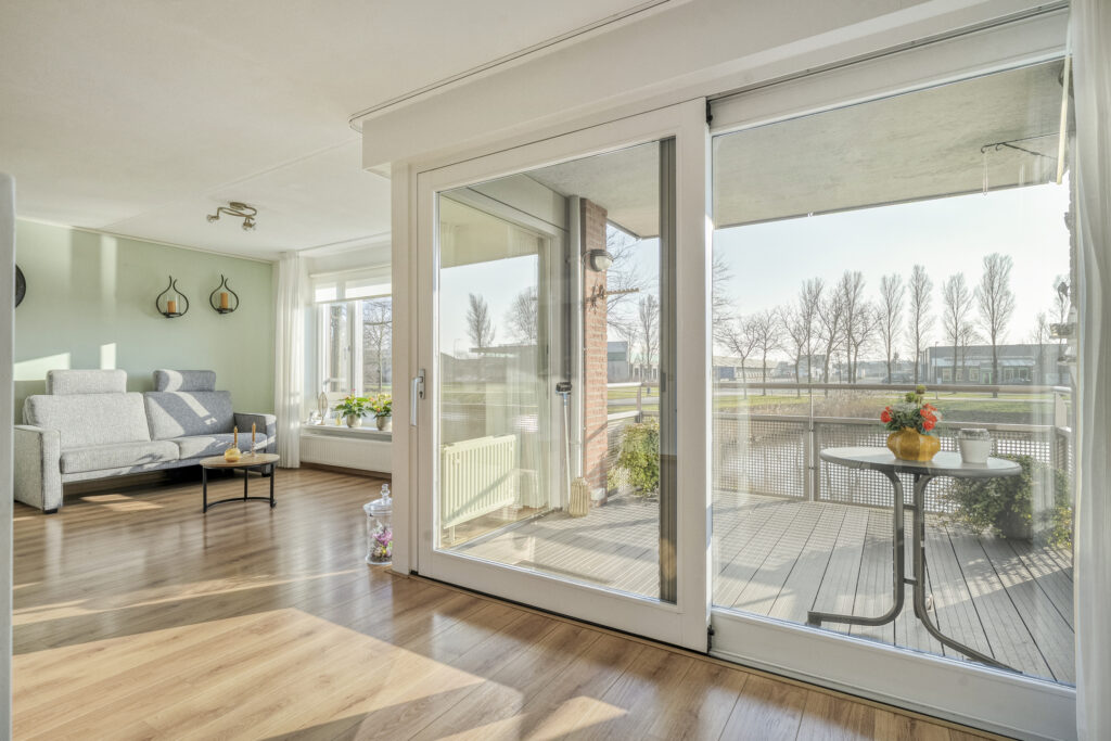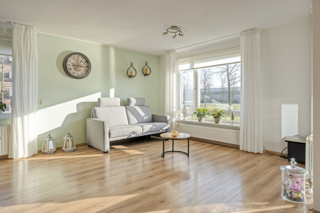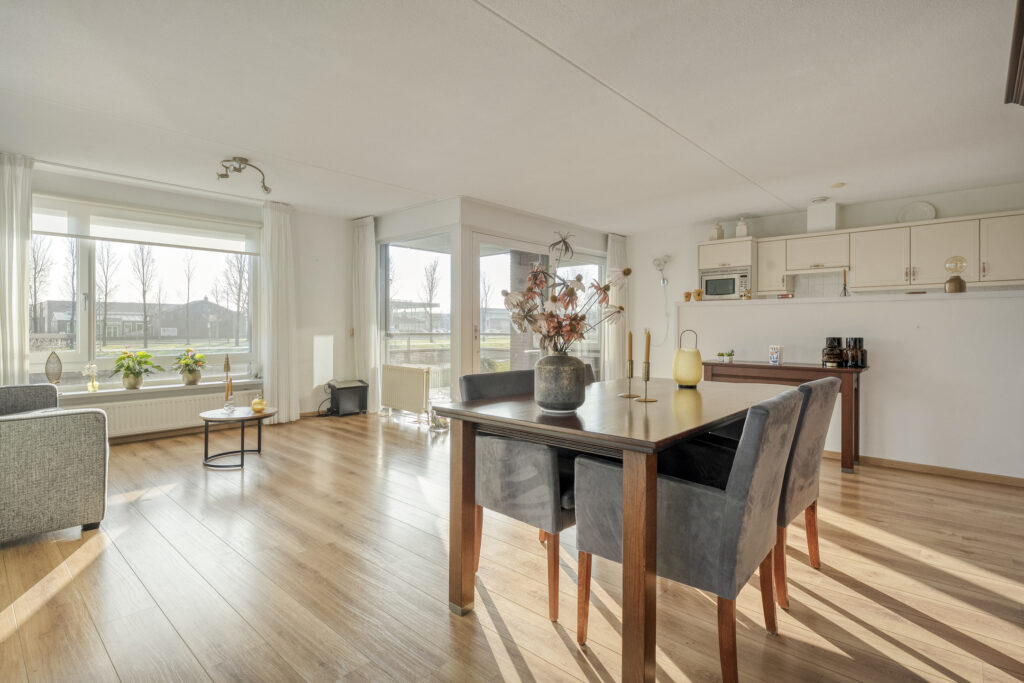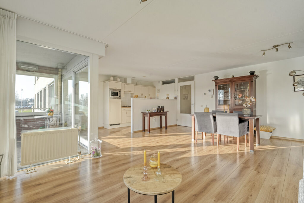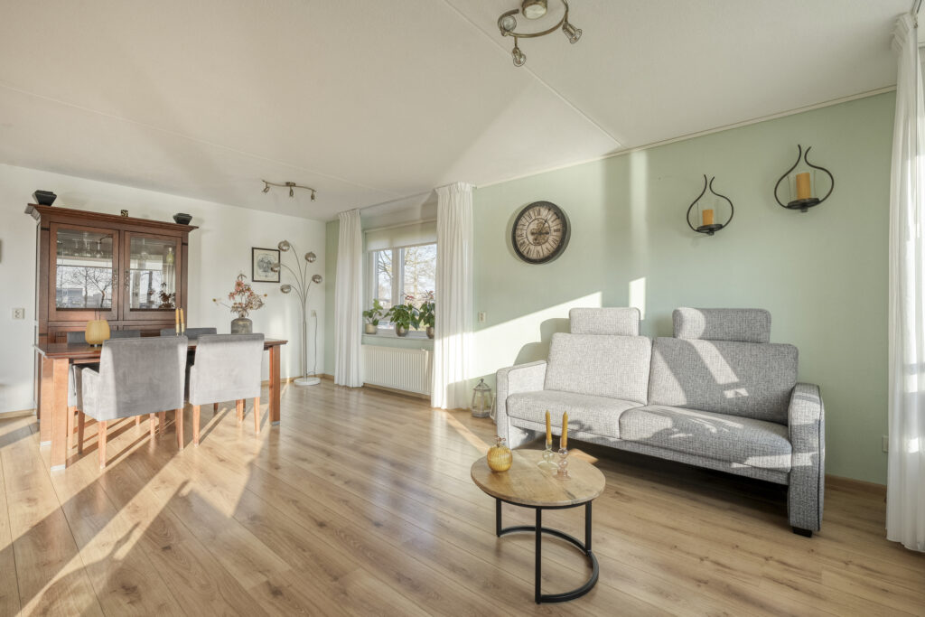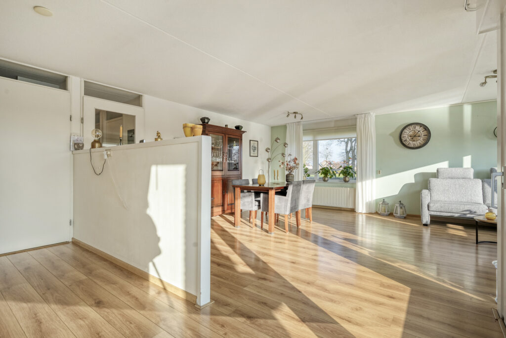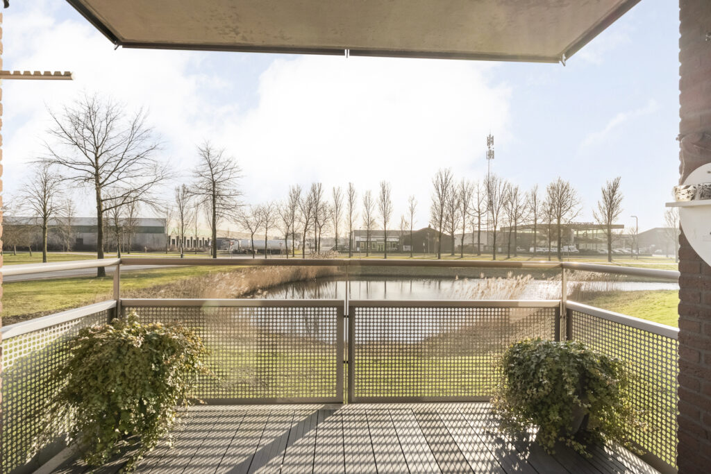 Aan de voorzijde bevindt zich de royale woonkamer. Dankzij de brede schuifpui is er een prettige lichtinval en een mooie verbinding met buiten. De loggia is direct vanuit de woonkamer bereikbaar en biedt een heerlijk uitzicht over de vijver. Kortom, een fijne plek om in alle rust van het buitenleven te genieten.