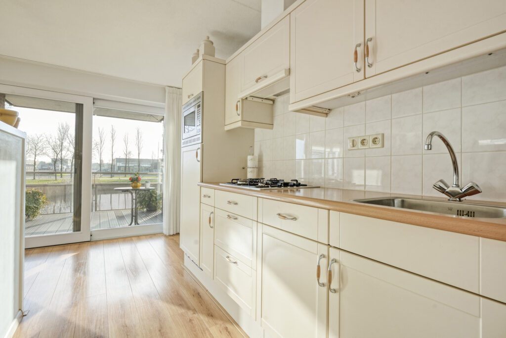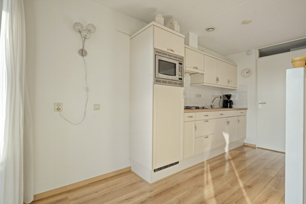 De keuken is praktisch gesitueerd naast de woonkamer en uitgevoerd met diverse inbouwapparatuur, waaronder een combi-magnetron, koelkast en gasstel. Aansluitend bevindt zich de bijkeuken met extra bergruimte en opstelmogelijkheden voor witgoed.