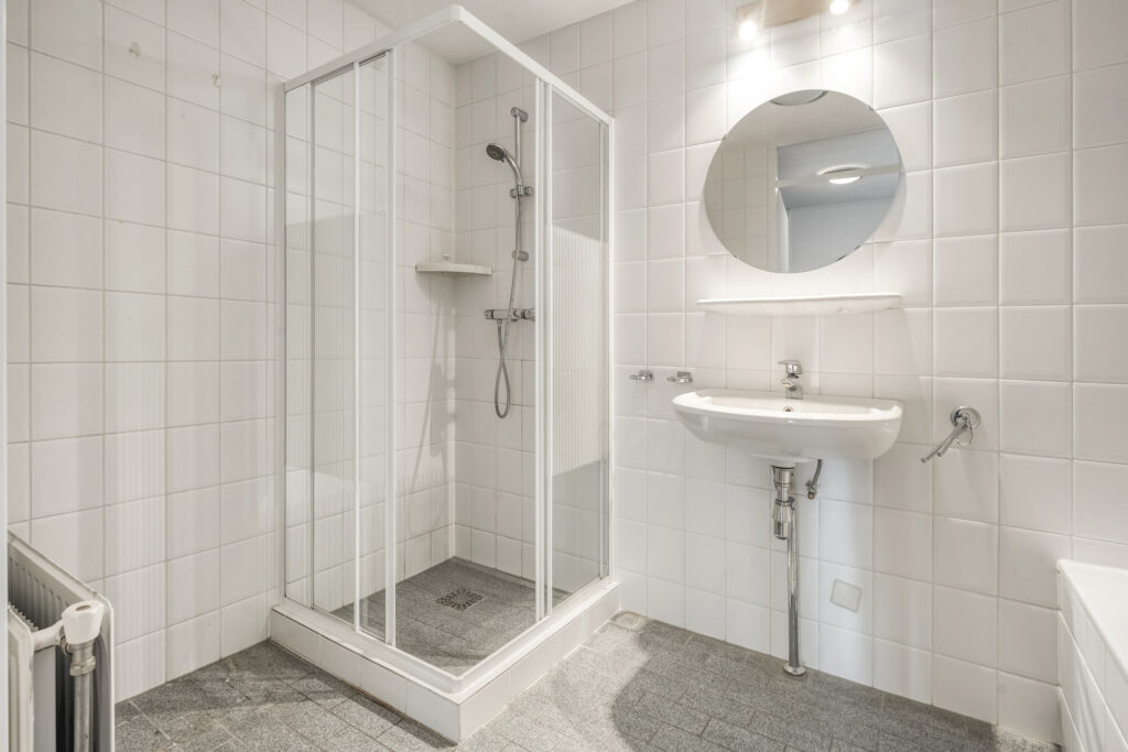De badkamer is voorzien van een douchecabine, ligbad en enkele wastafel. Het toilet is separaat, wat extra comfort biedt in het dagelijks gebruik.