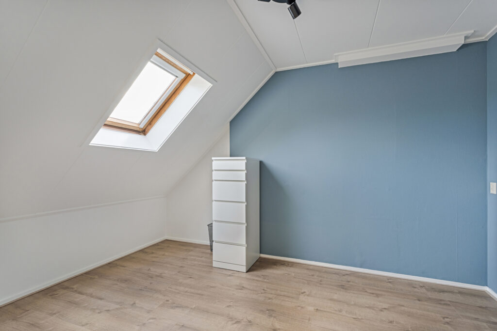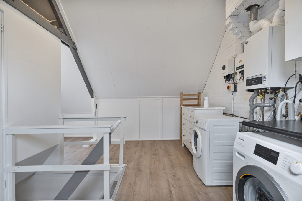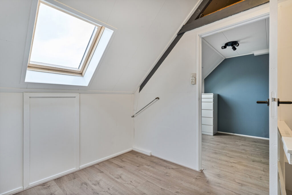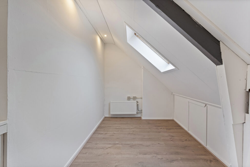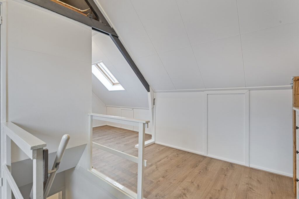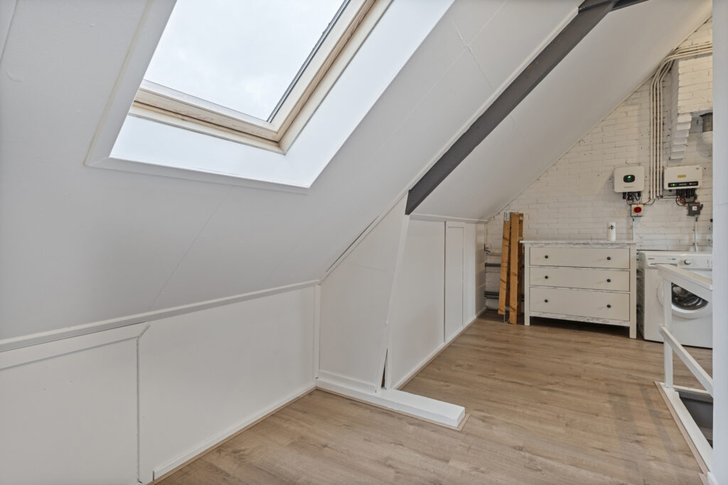Tweede verdieping: Voorzolder met twee dakramen, C.V.-opstelling, omvormers, wasmachine-aansluiting, keukenblok met bovenkasten en bergruimte achter knieschotten. Via de voorzolder heb je toegang tot de 4e slaapkamer, welke nu als werkkamer gebruikt wordt. Deze is eveneens voorzien een dakraam.
