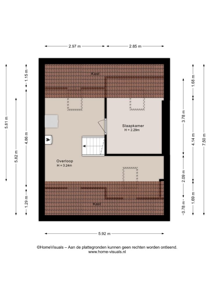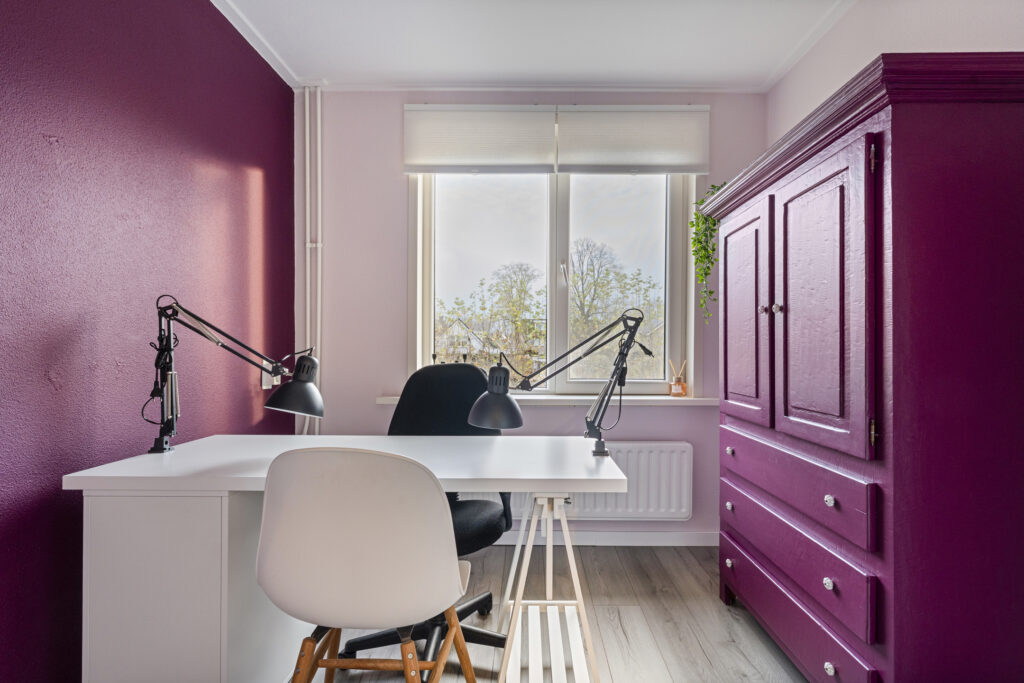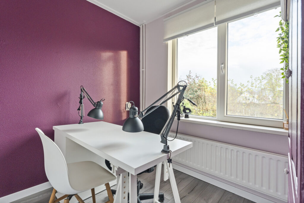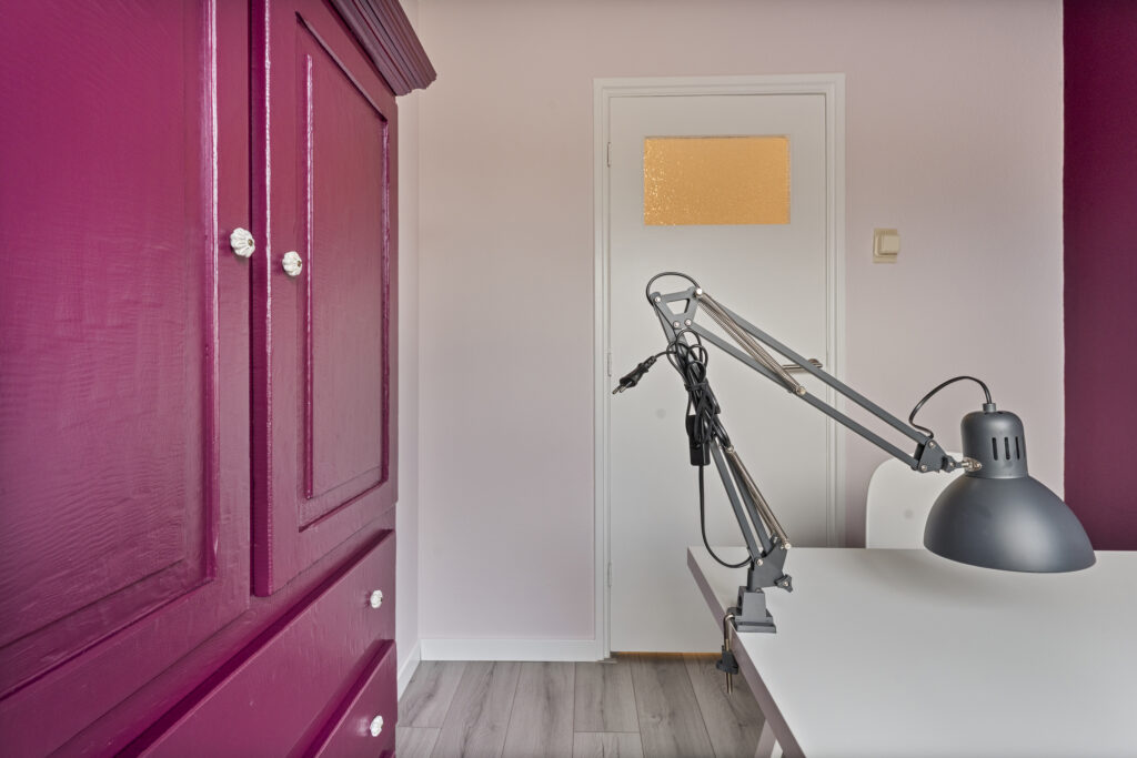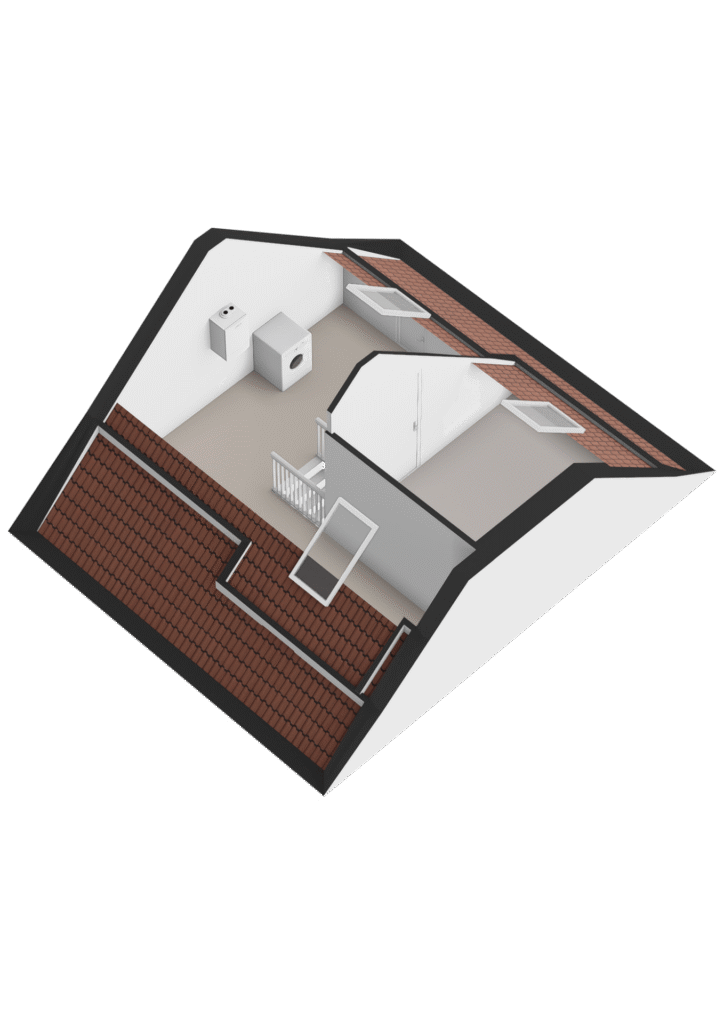 Tweede verdieping: Voorzolder met twee dakramen, C.V.-opstelling, omvormers, wasmachine-aansluiting, keukenblok met bovenkasten en bergruimte achter knieschotten. Via de voorzolder heb je toegang tot de 4e slaapkamer, welke nu als werkkamer gebruikt wordt. Deze is eveneens voorzien een dakraam.