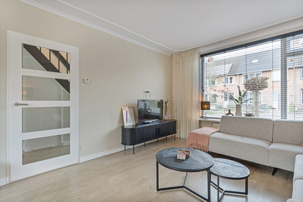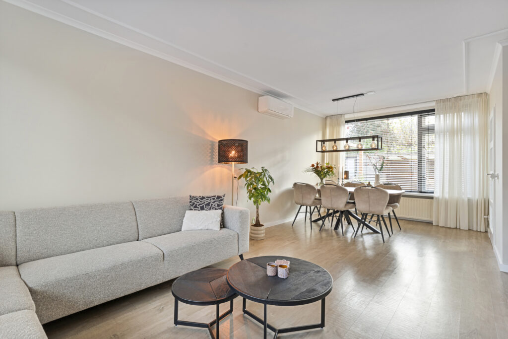 Begane grond: Entree/hal met meterkast, trapkast, toilet, trapopgang naar de eerste verdieping en toegang tot de woonkamer. De woonkamer met parketvloer is heerlijk licht door de grote raampartijen, heeft een airco die zowel kan koelen als verwarmen en geeft toegang tot de dichte keuken. De dichte keuken is voorzien van een lichte en moderne inbouwkeuken met inbouwapparatuur waaronder een afzuigkap, spoelbak, keukenboiler, gasfornuis, magnetron, vaatwasser, oven en koelkast. Tevens geeft de keuken toegang tot de achtertuin met terras.