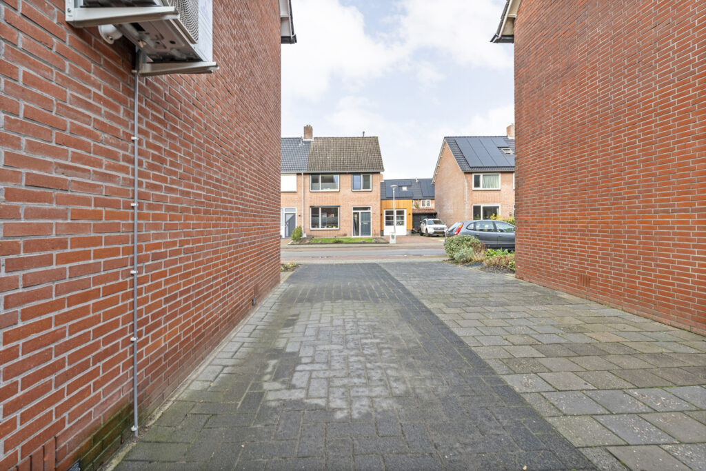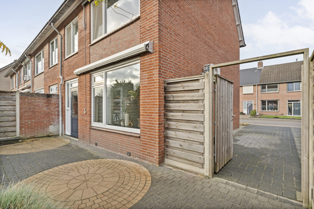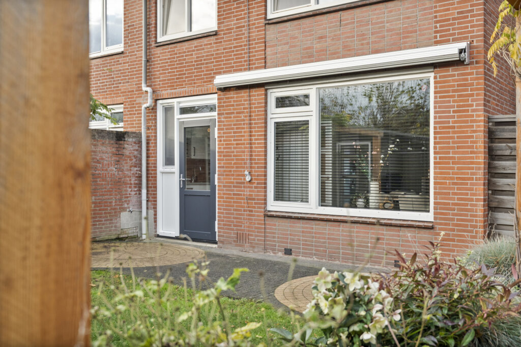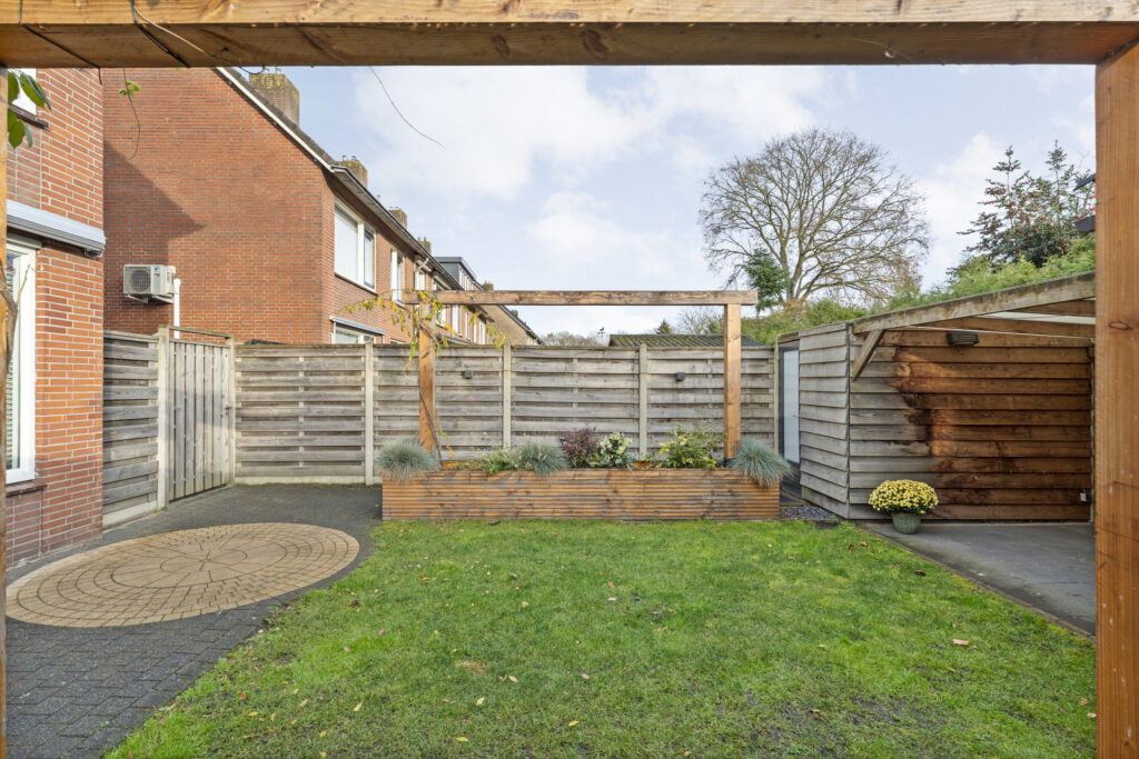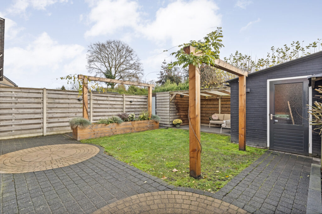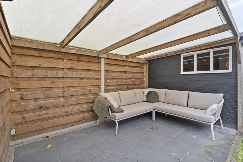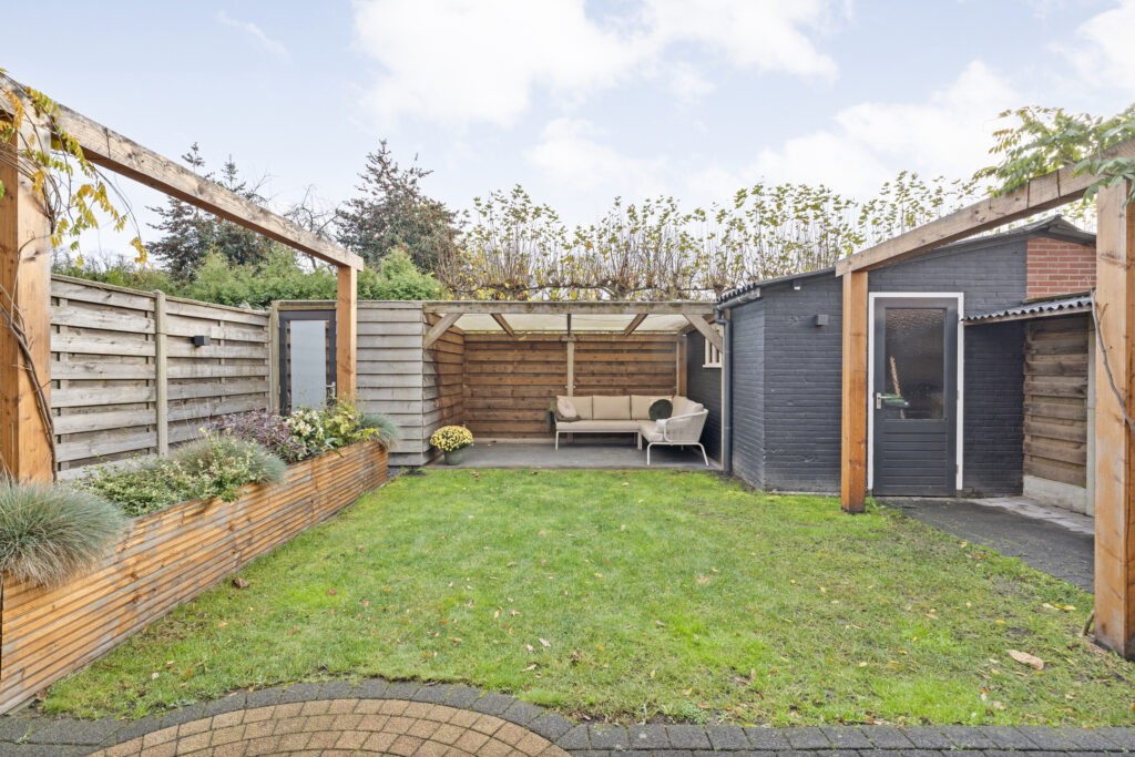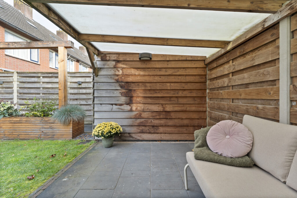 Buiten: De achtertuin met terras is gelegvoorzieningen en op het heerlijke zuiden en biedt veel privacy, waardoor je met mooi weer heerlijk in het zonnetje kunt zitten en genieten van een kopje koffie of een heerlijk glaasje wijn. Ook is er een stenen berging aanwezig met elektra, een overkapping waar je heerlijk kunt vertoeven en een houten berging voor het stallen van de fietsen.