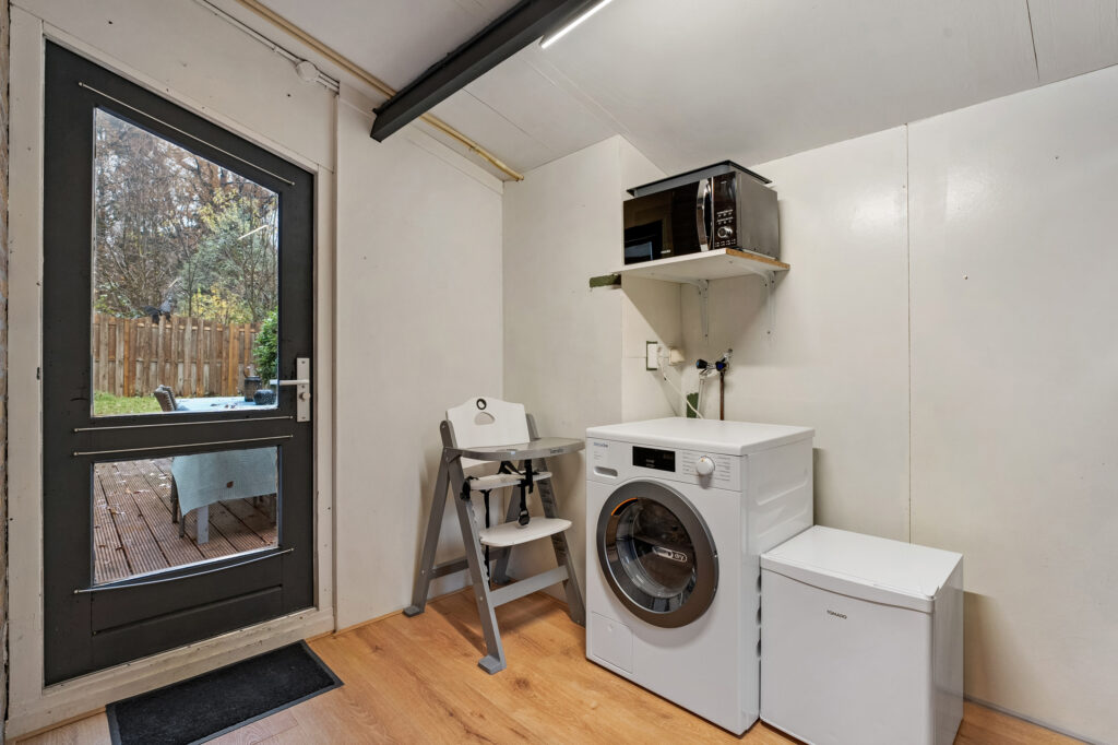 Begane grond: Via de entree bereik je de luxe keuken aan de voorzijde, compleet met kastenwand waarin de cv-installatie en apparatuur fraai zijn weggewerkt. De ruime lichte woonkamer grenst aan de keuken en is v.v. vloerverwarming en heeft openslaande deuren naar de tuin. Vanuit de woonkamer is er toegang tot de trap naar boven en een slaapkamer op de begane grond. Rechts van de entree bevindt zich de bijkeuken, die is uitgerust met witgoedaansluitingen en ideaal is voor opslag. De badkamer heeft een ruime inloopdouche, toilet en wastafel met meubel.