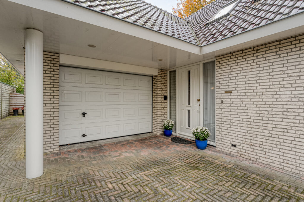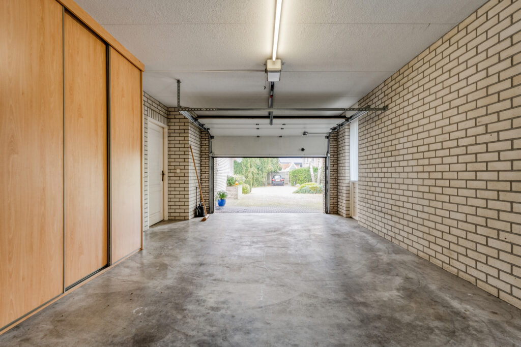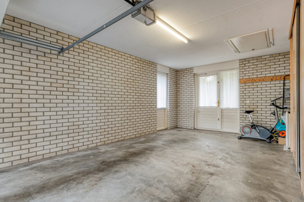 Aangrenzend aan de woning bevindt zich een ruime garage met elektrische deur, waar je met gemak een auto en fietsen kwijt kunt en die via een deur toegang geeft tot de achtertuin.