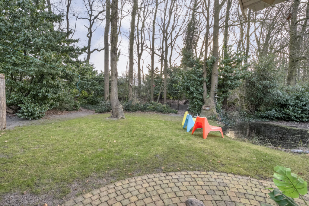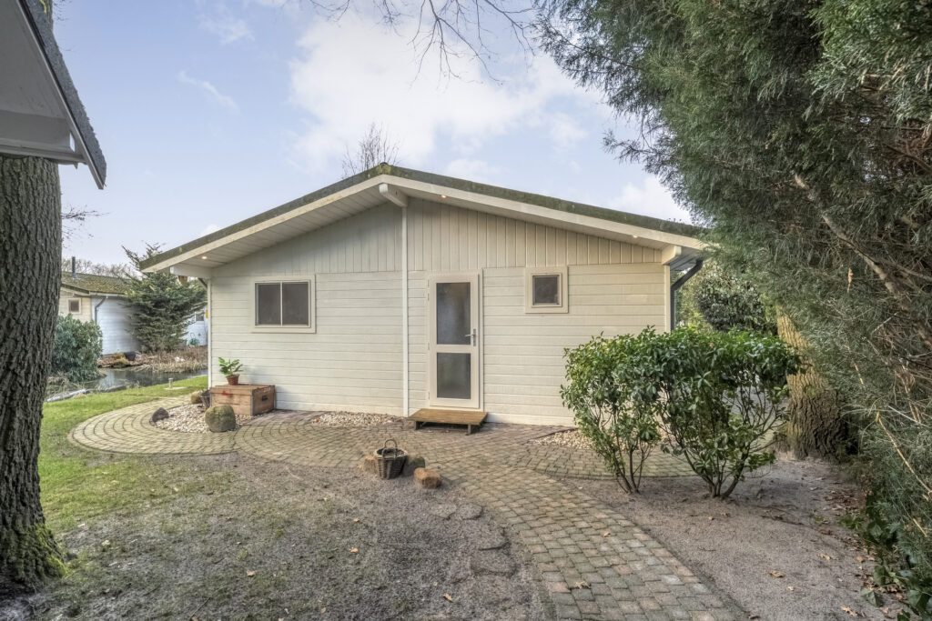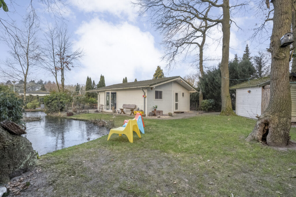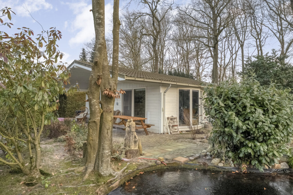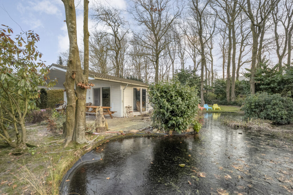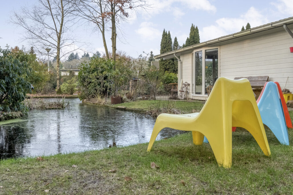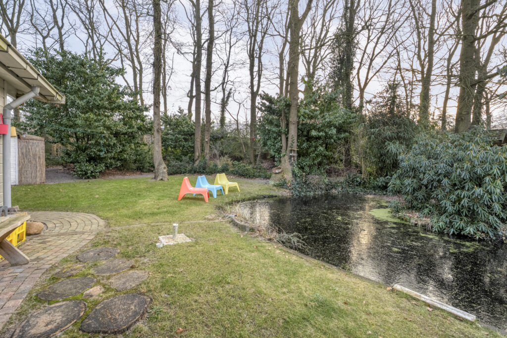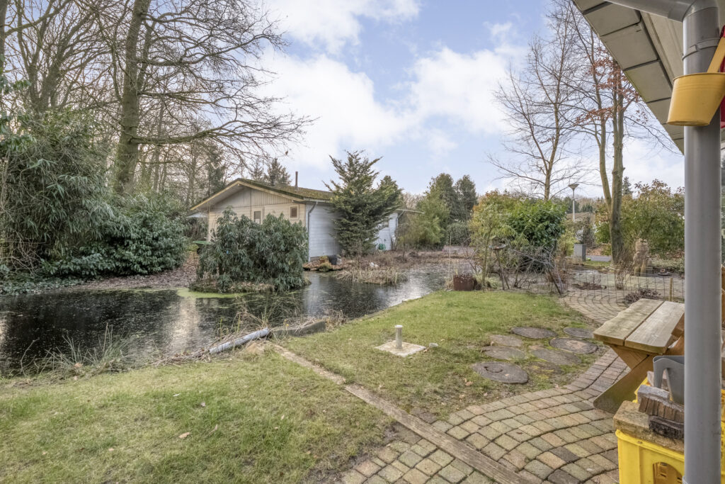 De tuin rondom de woning is ruim en biedt veel privacy door de ligging aan de rand van het park. De eigen vijver en de vrijstaande houten berging maken het geheel compleet.