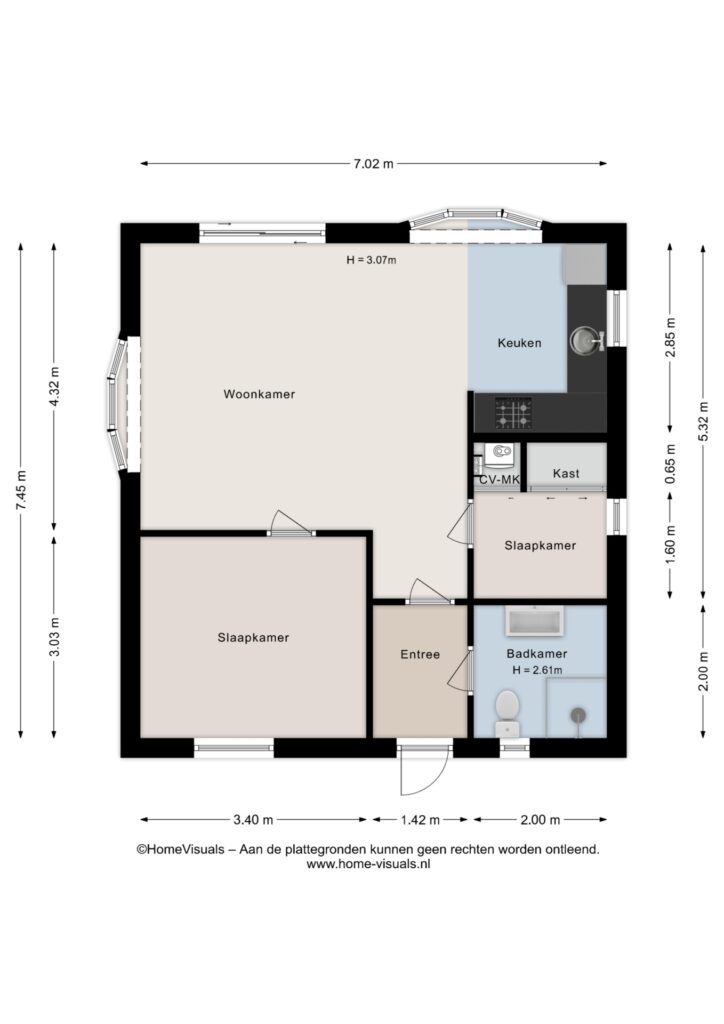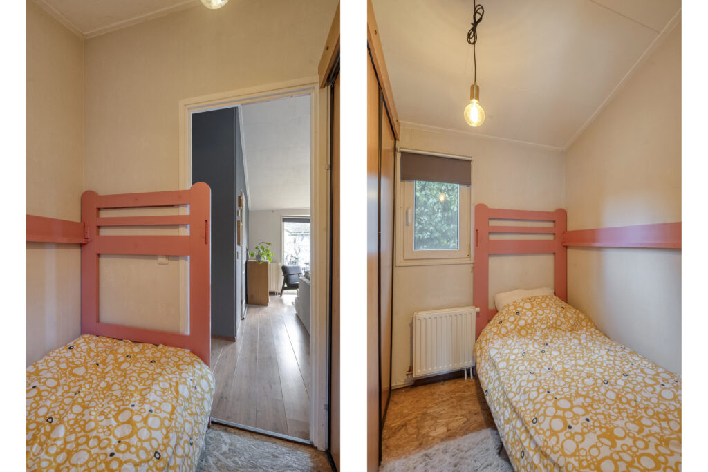 De woning beschikt over twee slaapkamers, waarvan één royaal en één geschikt als logeer- of werkkamer. Daarnaast is er een aparte kast-/CV-ruimte.