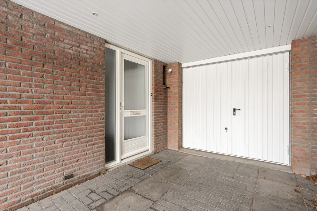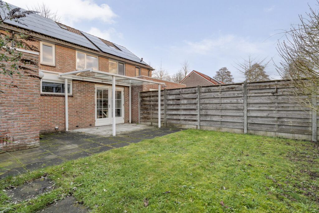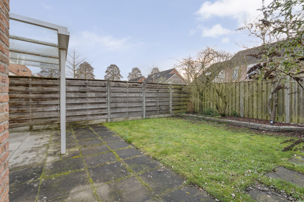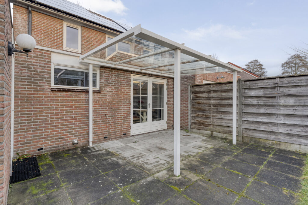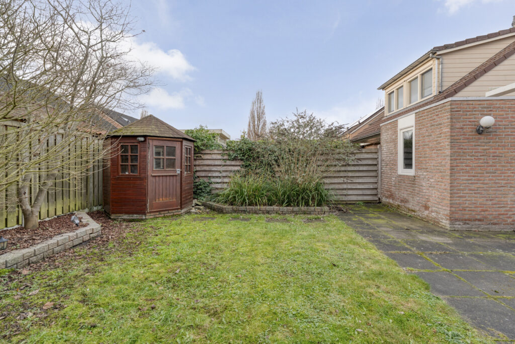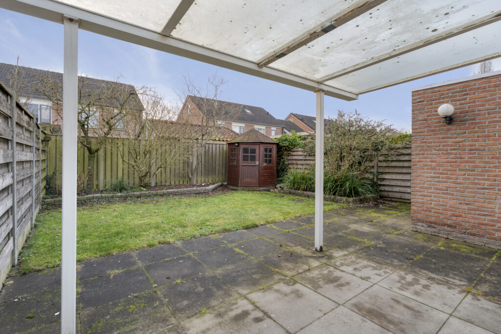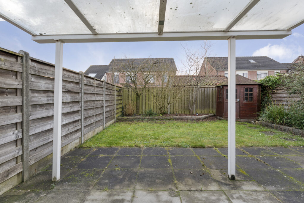 Buiten: Nette voortuin en oprit met parkeergelegenheid voor ongeveer 2 auto’s. De achtertuin is gelegen op het zuiden en voorzien van een houten berging en overkapping aan de achterzijde bij het terras.