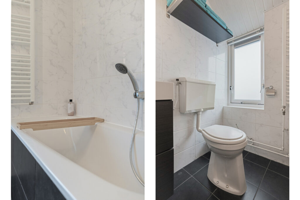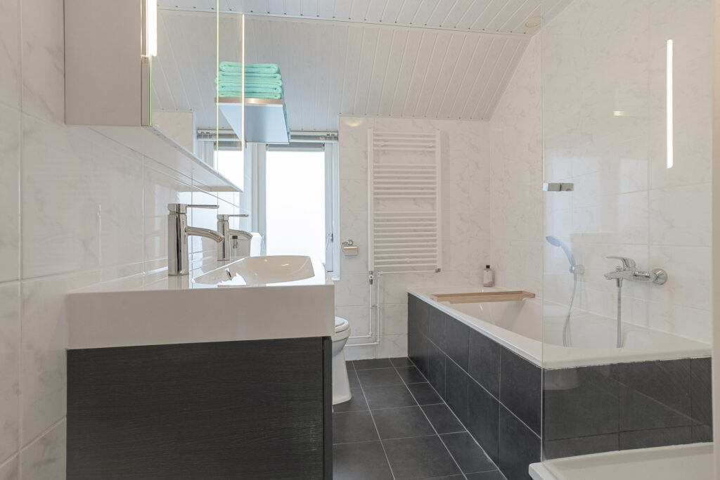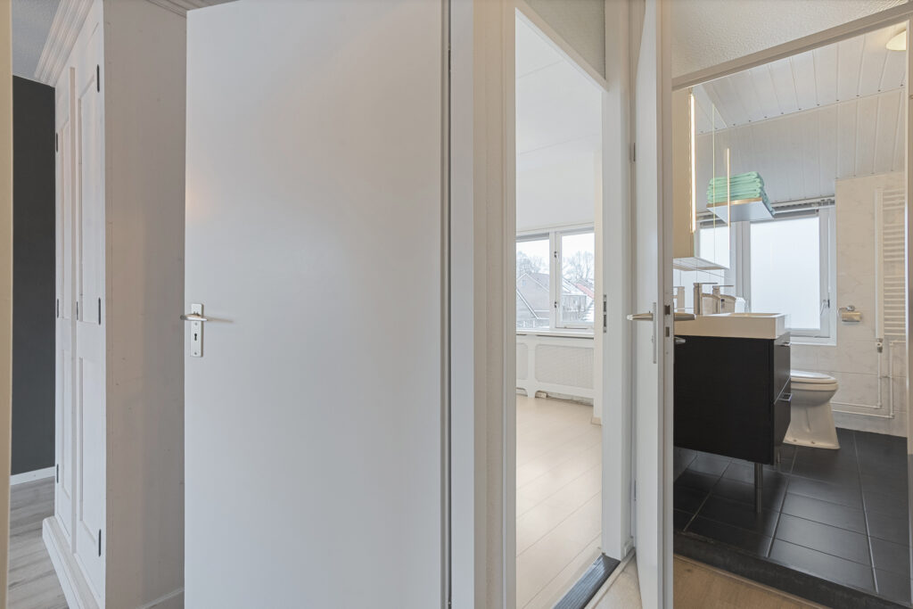 Eerste verdieping: Overloop met airconditioning en toegang tot een drietal slaapkamers en de badkamer. De badkamer ligt aan de achterzijde van de woning en beschikt over een wastafelmeubel met dubbele kraan en spiegelkast, douchehoek, designradiator, toilet en een ligbad. De slaapkamer aan de achterzijde is voorzien van een vaste kast.