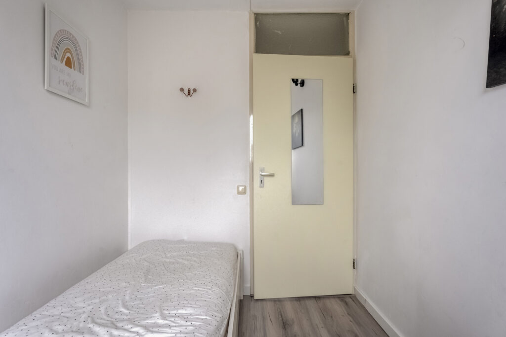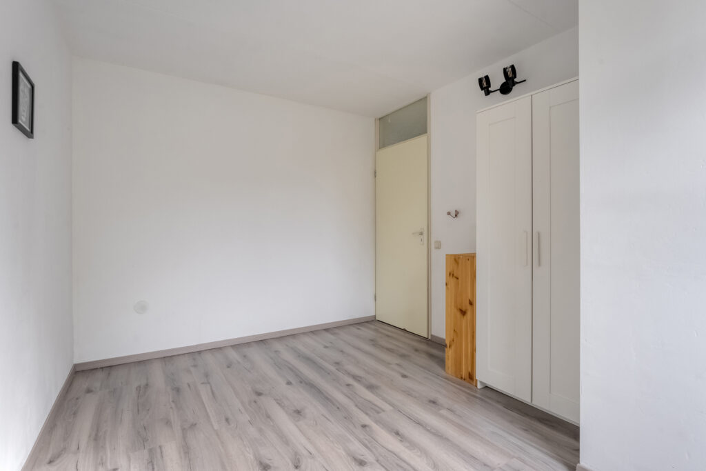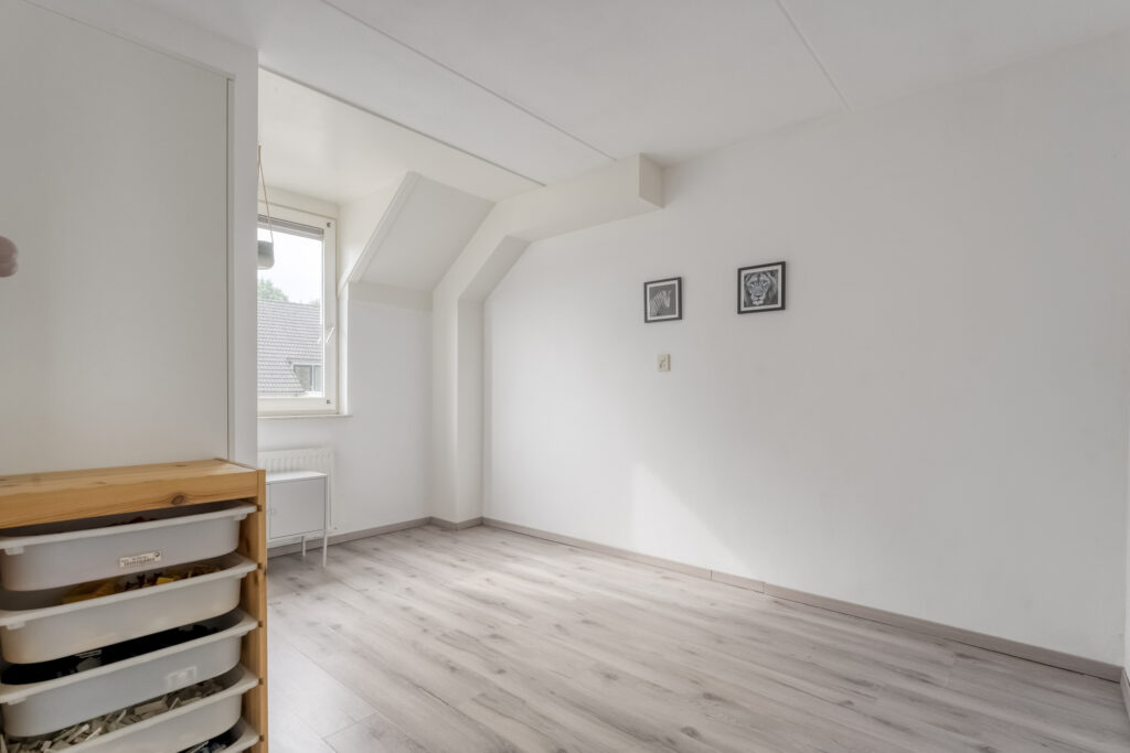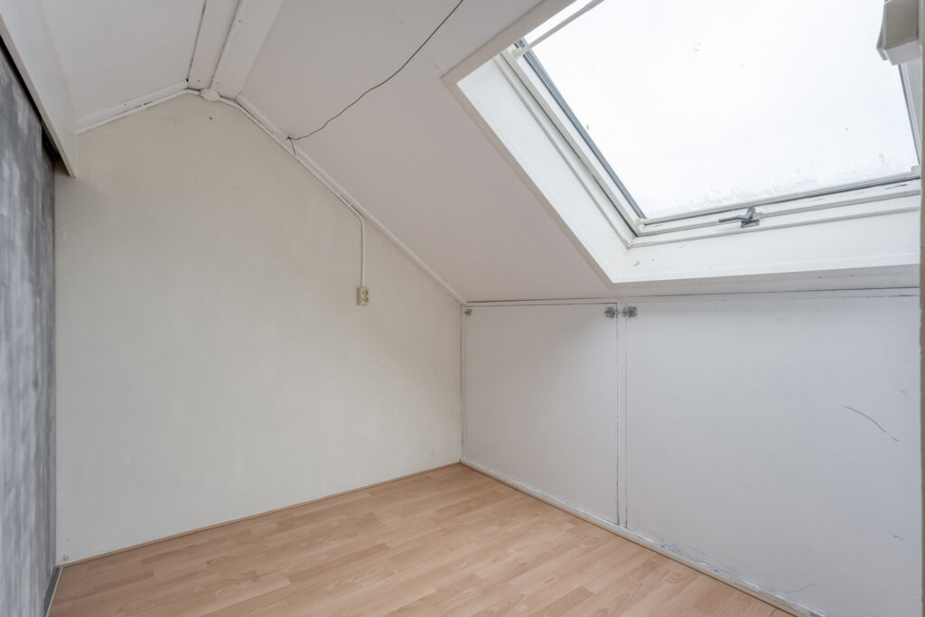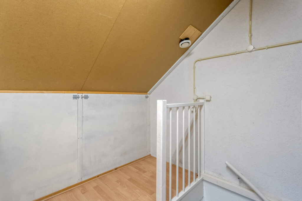 Tweede verdieping: Via vaste trap te bereiken tweede verdieping. Overloop met CV installatie en de wasmachine aansluiting, bergruimte achter de schuine wanden en toegang tot de vierde slaapkamer. Deze slaapkamer heeft een dakraam en een schuifwand voor de vaste kast.