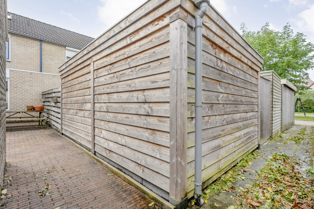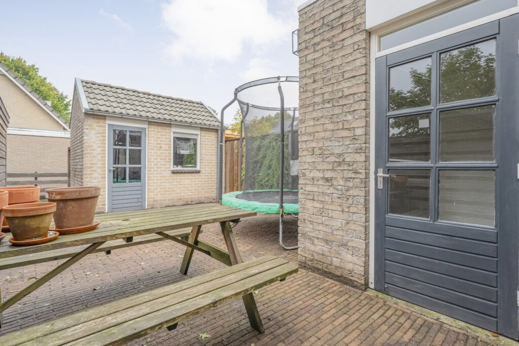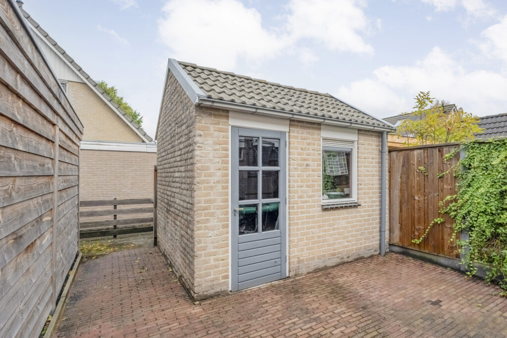 – Achtertuin met achterom en een stenen berging;