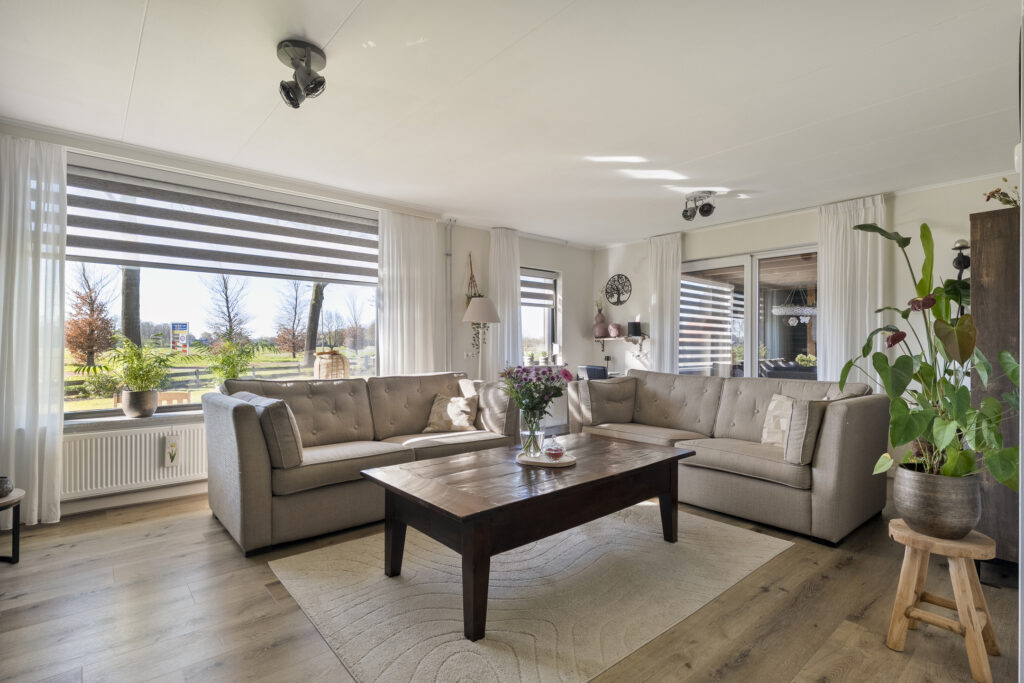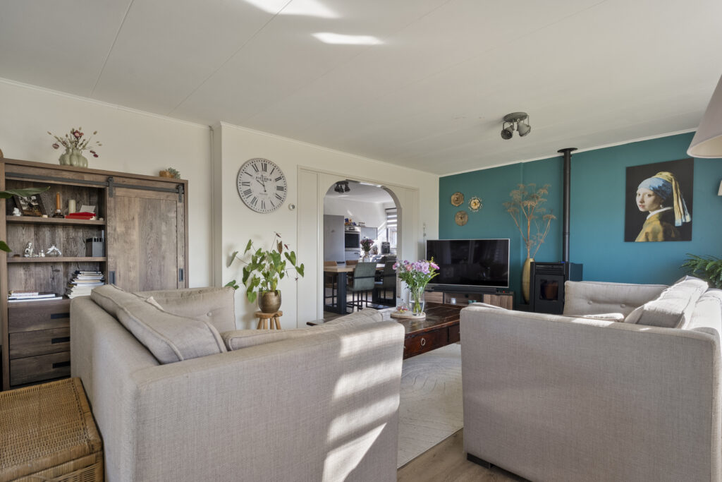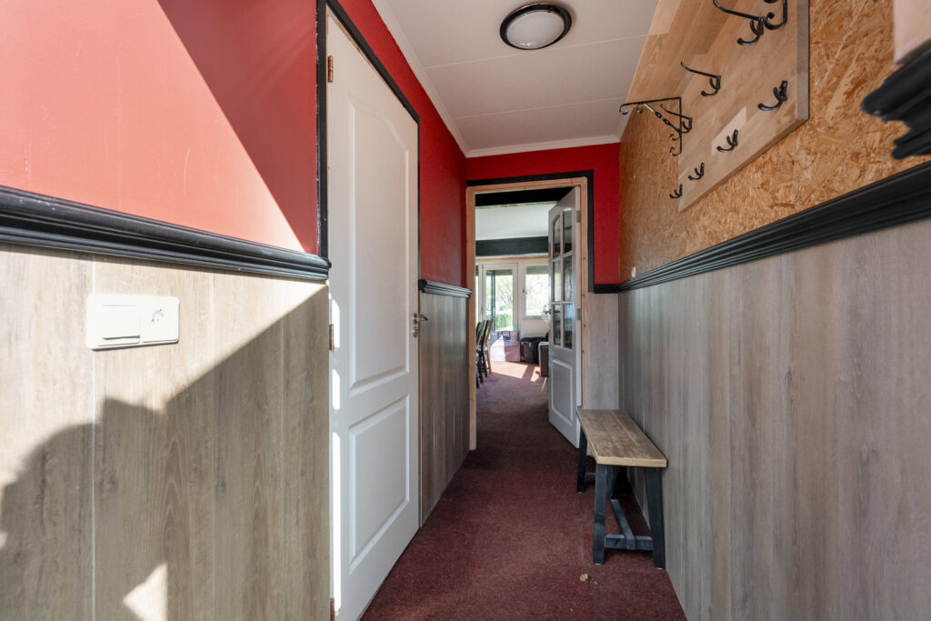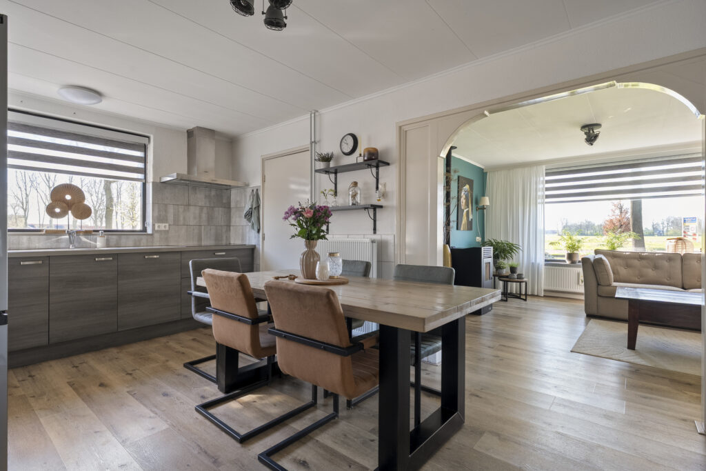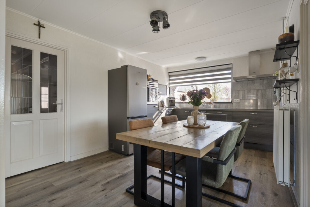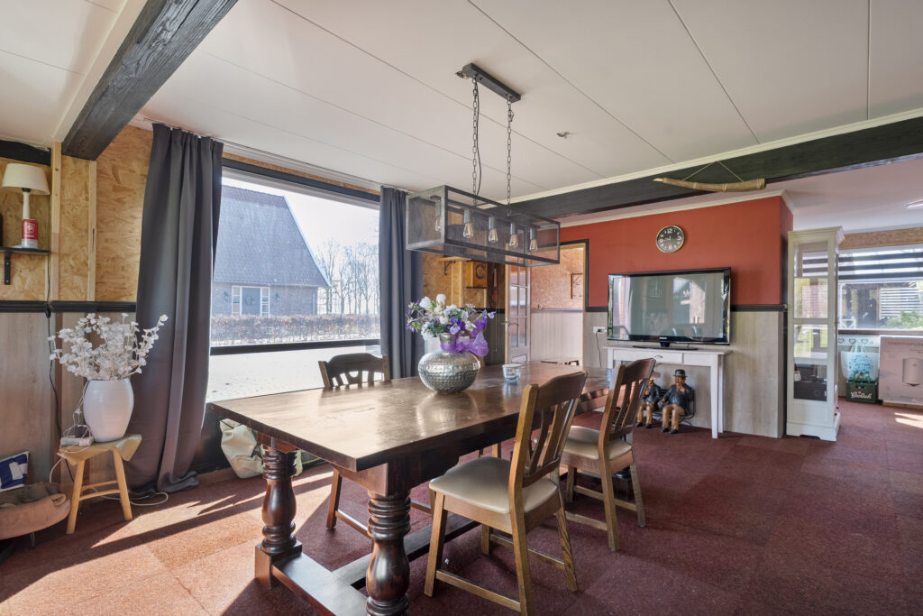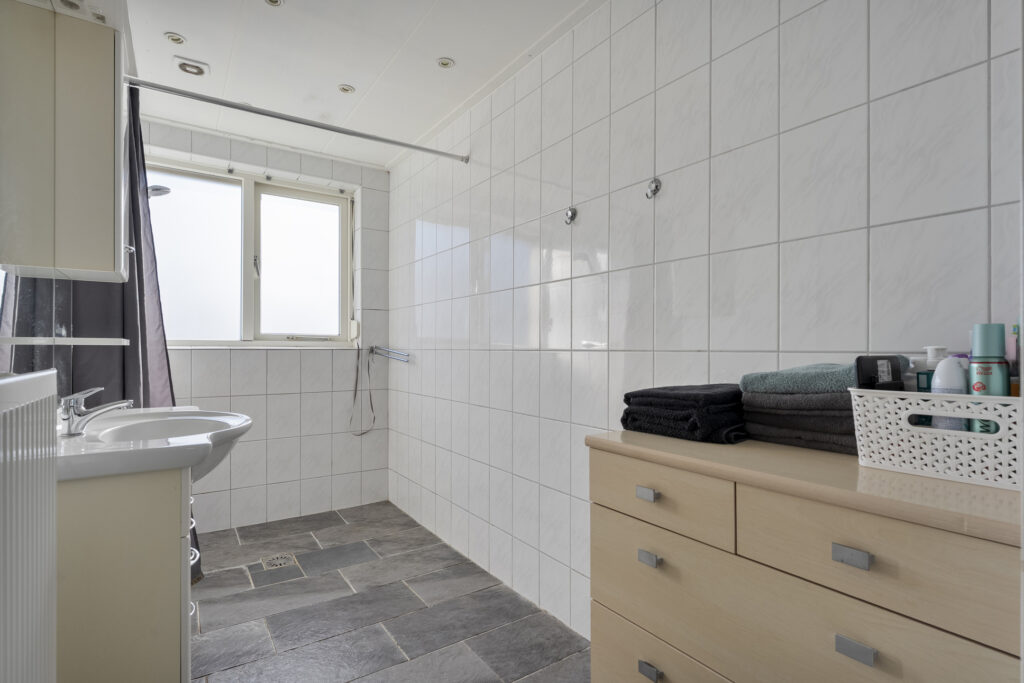Begane grond: via de lange oprit kom je bij de entree aan de zijkant van de woning, waar je een kast en de meterkast aantreft, net als de toiletruimte. Hiervandaan loop je via de keuken naar de woonkamer, welke heerlijk licht is én een fraai uitzicht biedt over de landerijen tegenover de woning. De keuken beschikt over een nette hoekopstelling met inductiekookplaat, oven, vaatwasser en koel-vriescombinatie. Daarnaast is er een vaste kast aanwezig met daarin de trap naar de verdieping. Vanuit de keuken is er verder toegang tot de hal en de bijkeuken, waar de witgoedaansluitingen gesitueerd. Vanuit de hal zijn de slaapkamers, de badkamer, een kantoor, een extra berging en de tweede toiletruimte te bereiken. De badkamer is voorzien van een wastafelmeubel en een douche.