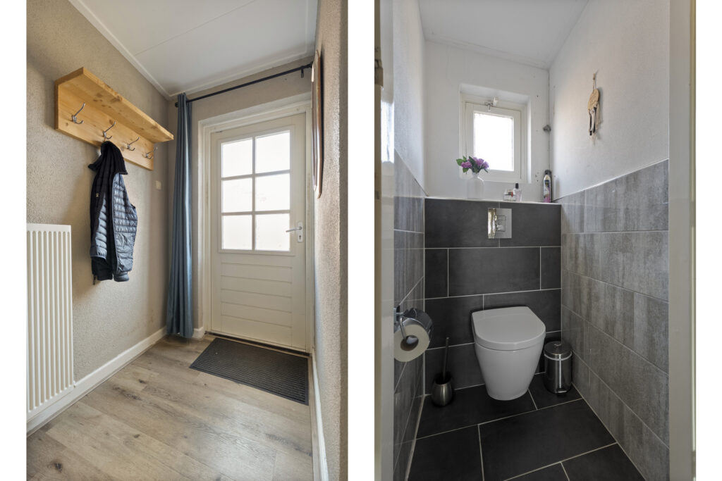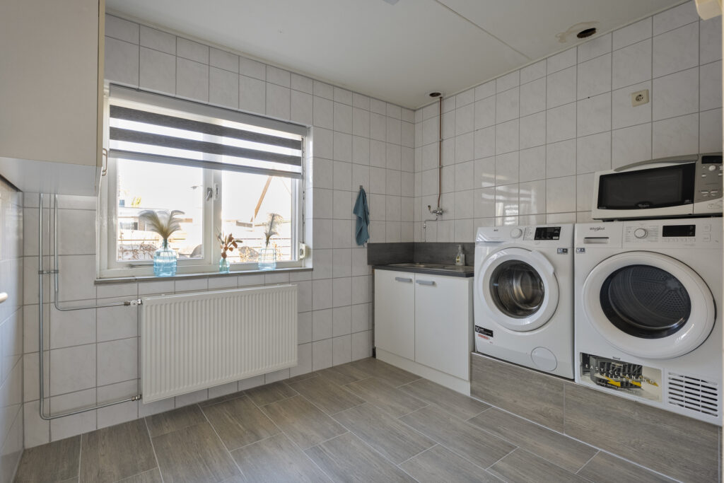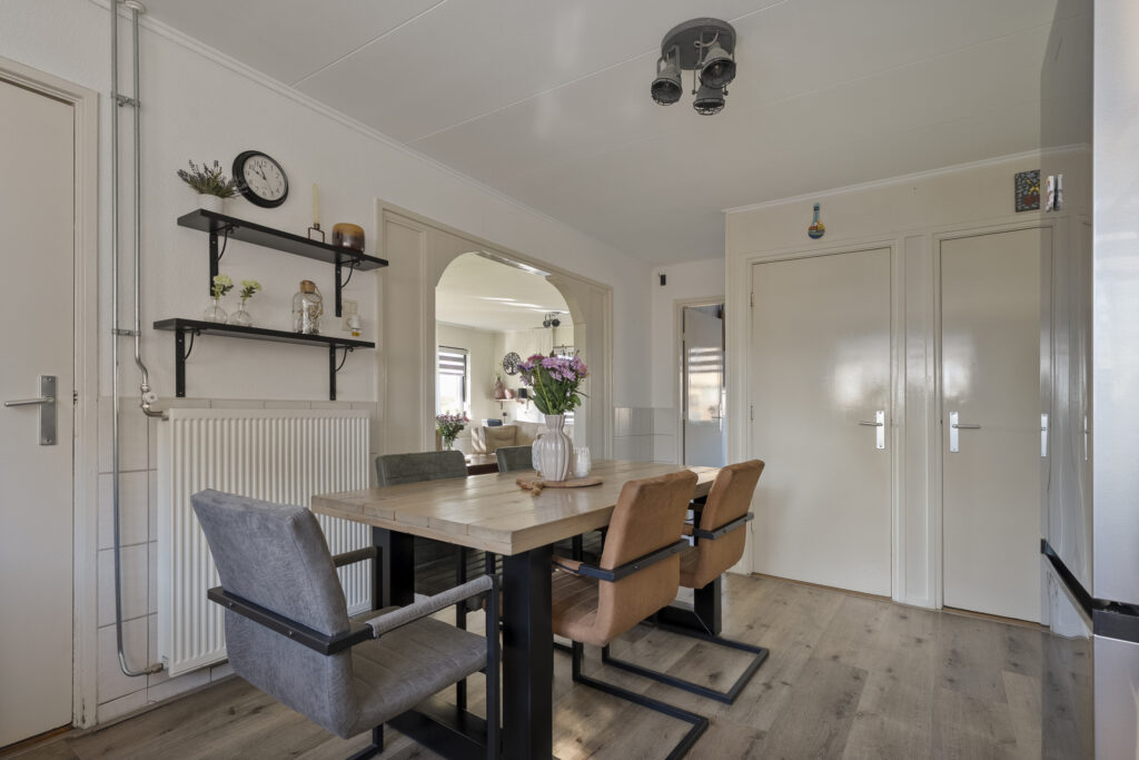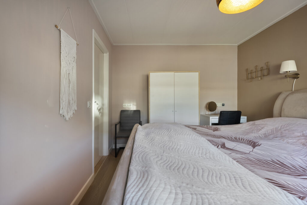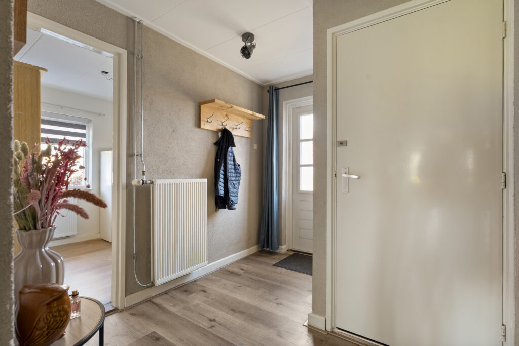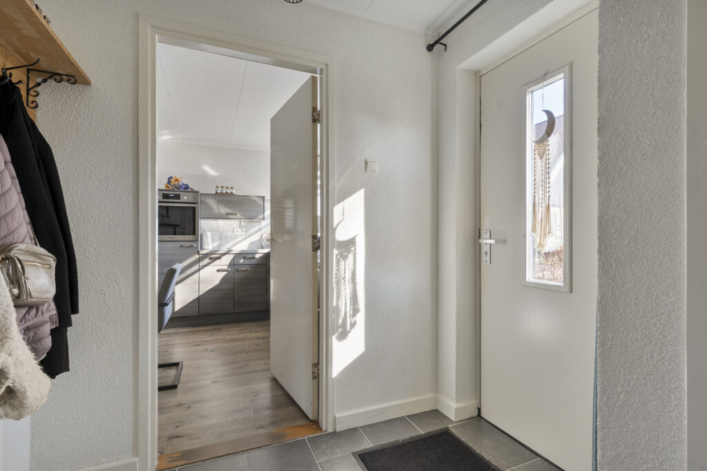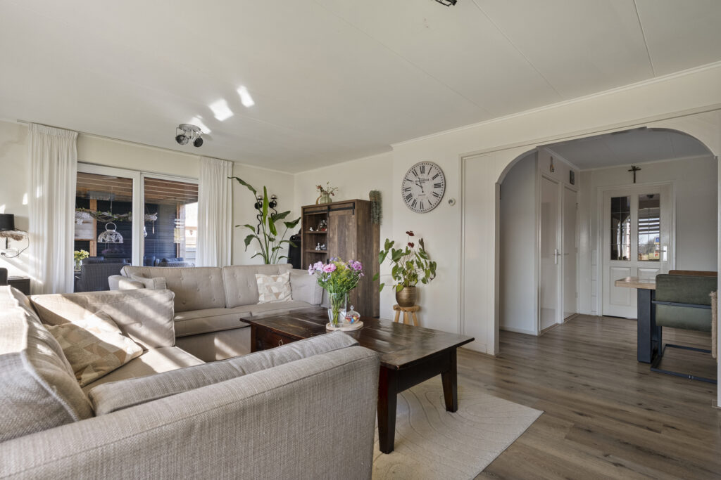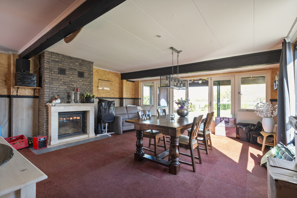 Begane grond: via de lange oprit kom je bij de entree aan de zijkant van de woning, waar je een kast en de meterkast aantreft, net als de toiletruimte. Hiervandaan loop je via de keuken naar de woonkamer, welke heerlijk licht is én een fraai uitzicht biedt over de landerijen tegenover de woning. De keuken beschikt over een nette hoekopstelling met inductiekookplaat, oven, vaatwasser en koel-vriescombinatie. Daarnaast is er een vaste kast aanwezig met daarin de trap naar de verdieping. Vanuit de keuken is er verder toegang tot de hal en de bijkeuken, waar de witgoedaansluitingen gesitueerd. Vanuit de hal zijn de slaapkamers, de badkamer, een kantoor, een extra berging en de tweede toiletruimte te bereiken. De badkamer is voorzien van een wastafelmeubel en een douche.