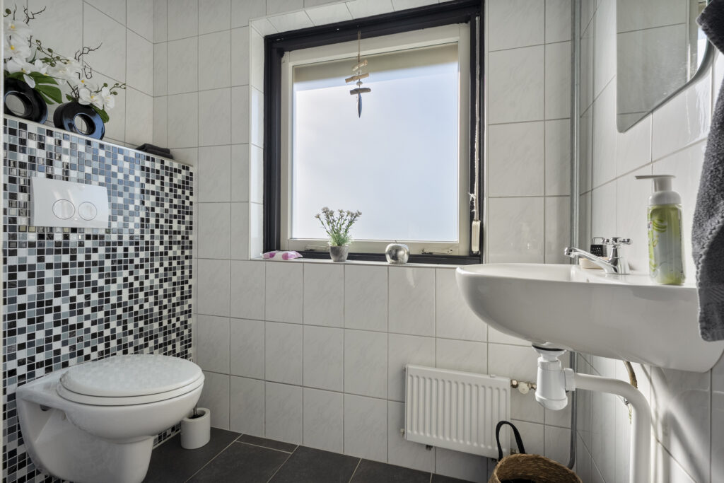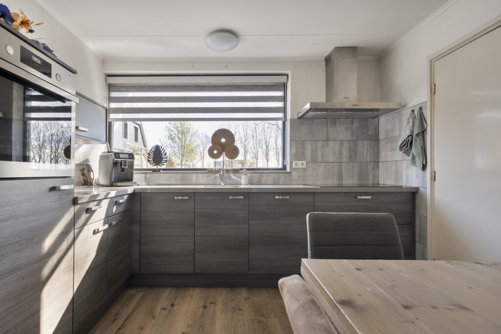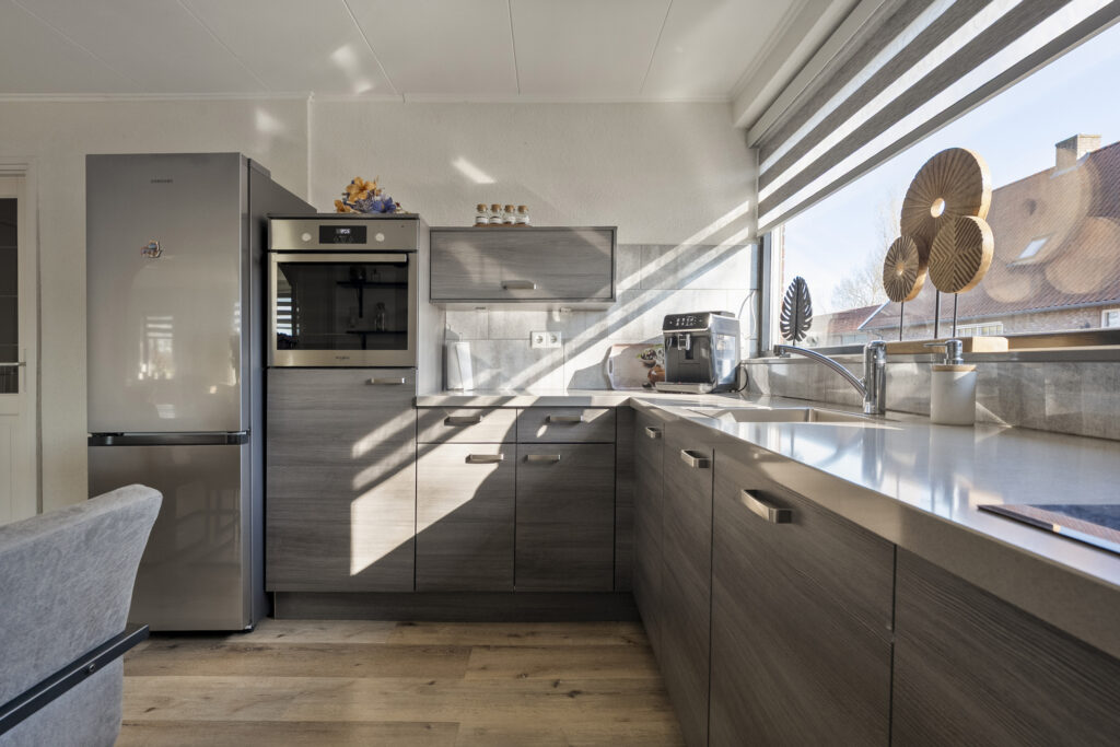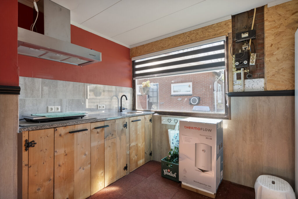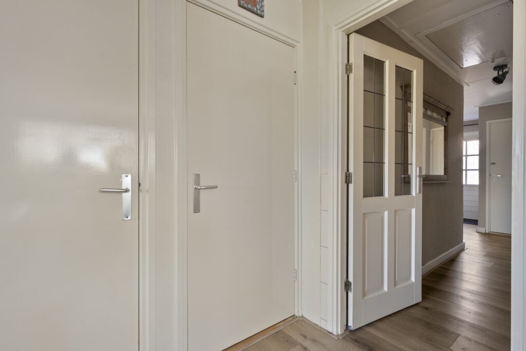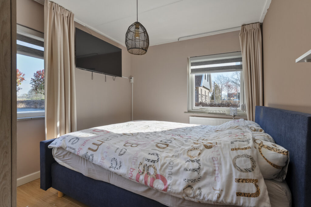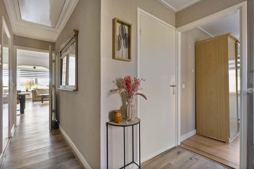 Begane grond: via de lange oprit kom je bij de entree aan de zijkant van de woning, waar je een kast en de meterkast aantreft, net als de toiletruimte. Hiervandaan loop je via de keuken naar de woonkamer, welke heerlijk licht is én een fraai uitzicht biedt over de landerijen tegenover de woning. De keuken beschikt over een nette hoekopstelling met inductiekookplaat, oven, vaatwasser en koel-vriescombinatie. Daarnaast is er een vaste kast aanwezig met daarin de trap naar de verdieping. Vanuit de keuken is er verder toegang tot de hal en de bijkeuken, waar de witgoedaansluitingen gesitueerd. Vanuit de hal zijn de slaapkamers, de badkamer, een kantoor, een extra berging en de tweede toiletruimte te bereiken. De badkamer is voorzien van een wastafelmeubel en een douche.