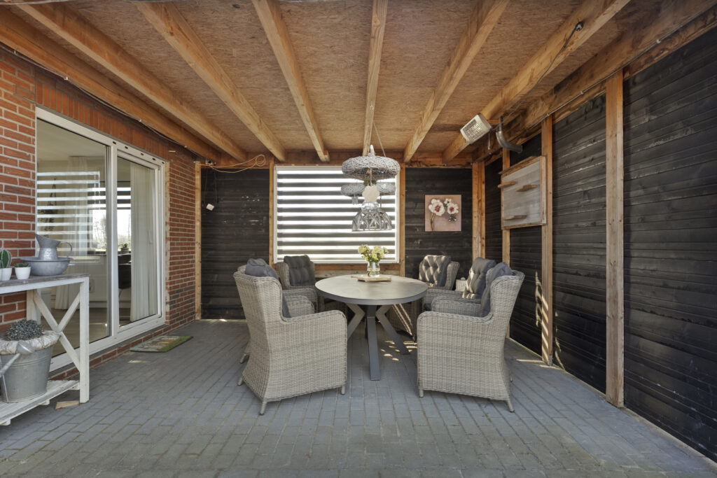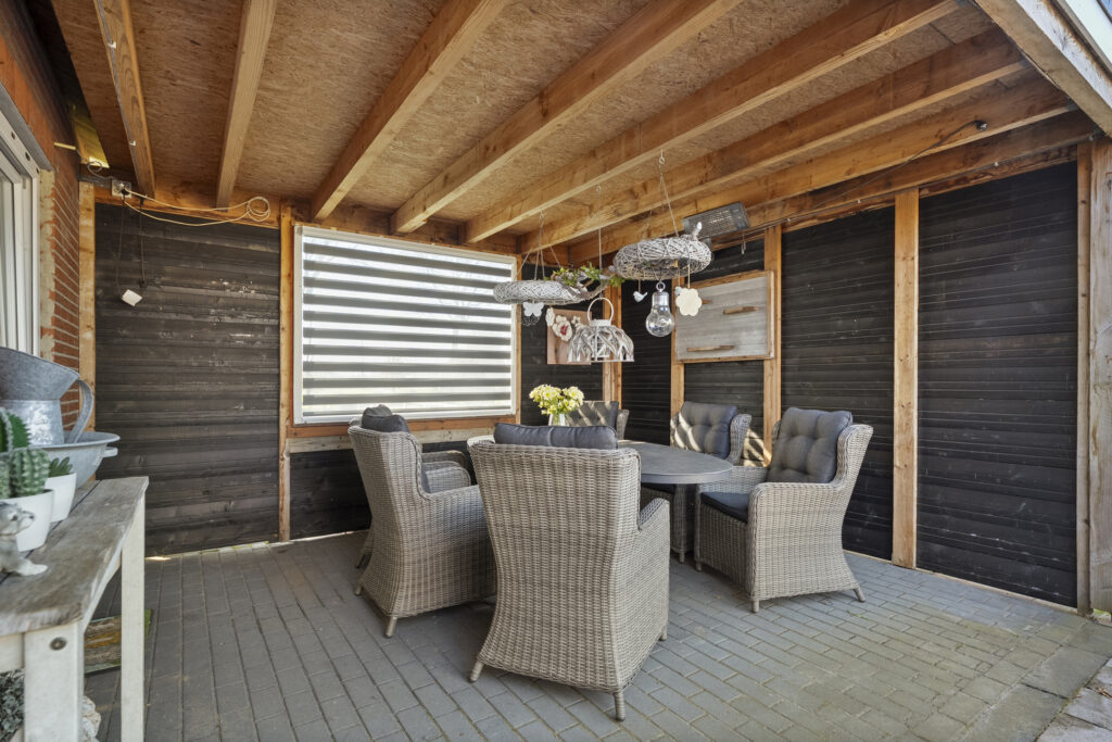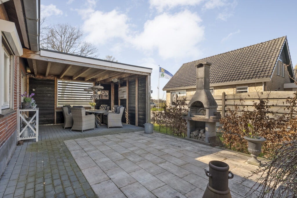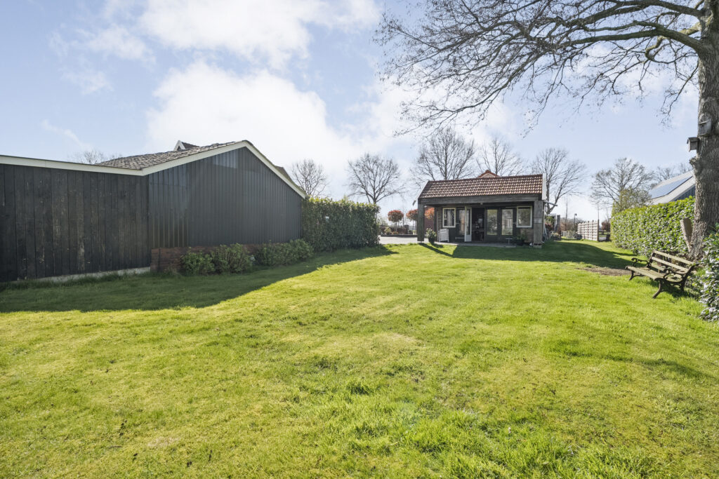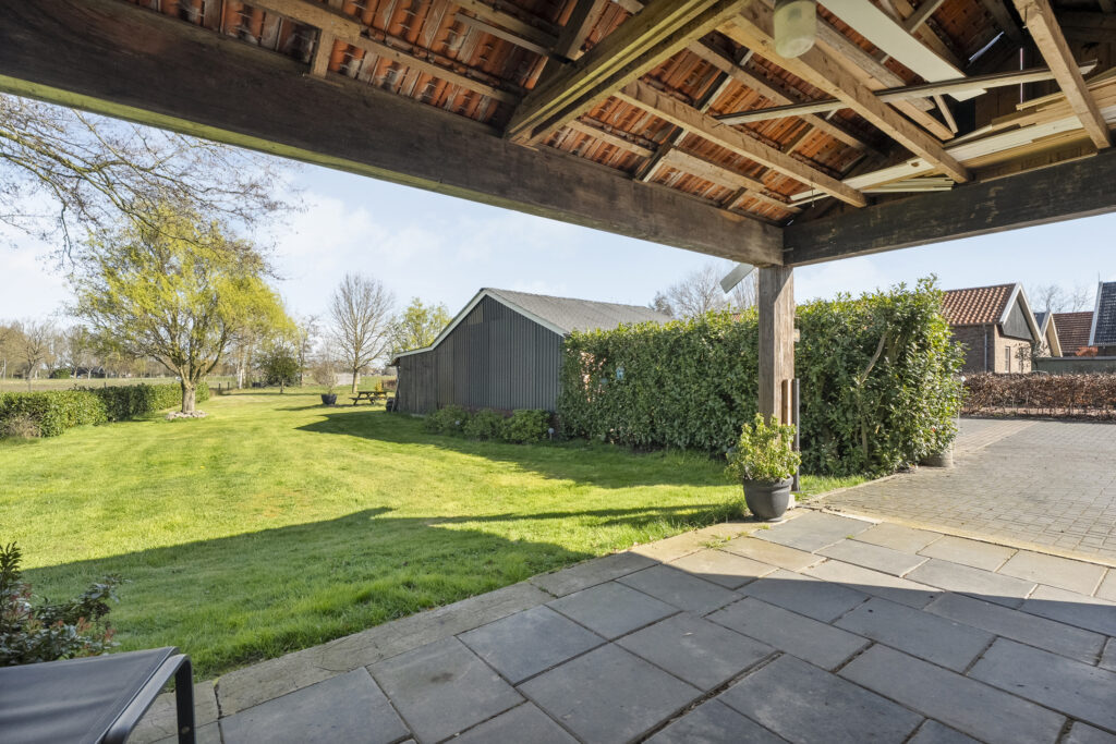 Achter de woning tref je een groot terras aan, waar je ook het bijgebouw vindt. Dit bijgebouw is voorzien van een badkamer, woonkamer en kleine keukenruimte. Onder de overkapping is het goed vertoeven. De achtertuin bestaat voor het grootste gedeelte uit gazon waar je een aantal bomen aantreft. In het verlengde van de oprit is een extra berging gesitueerd.