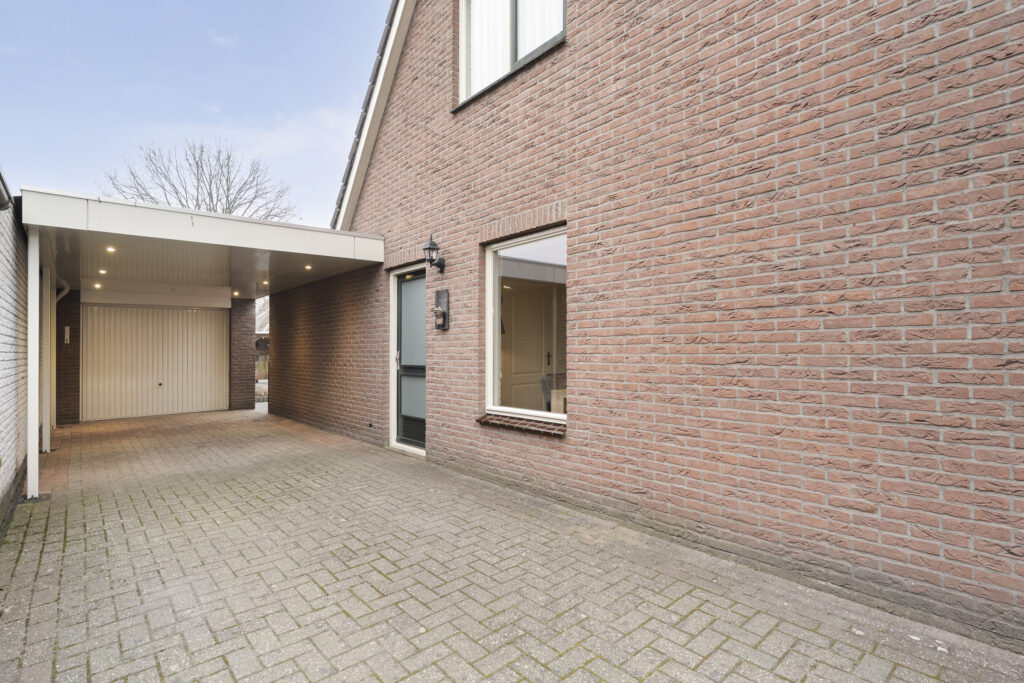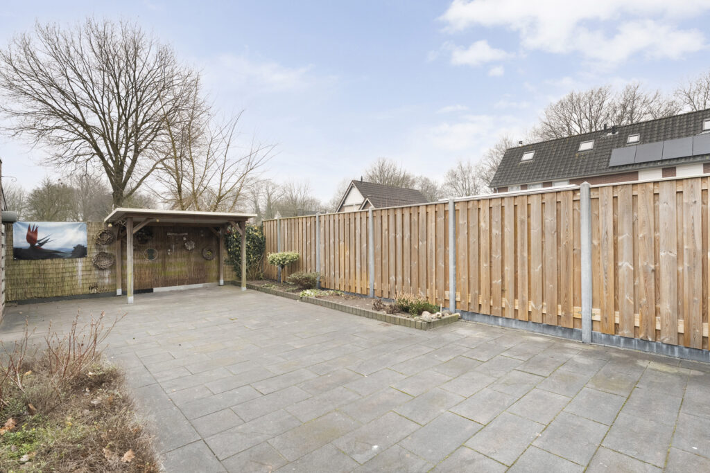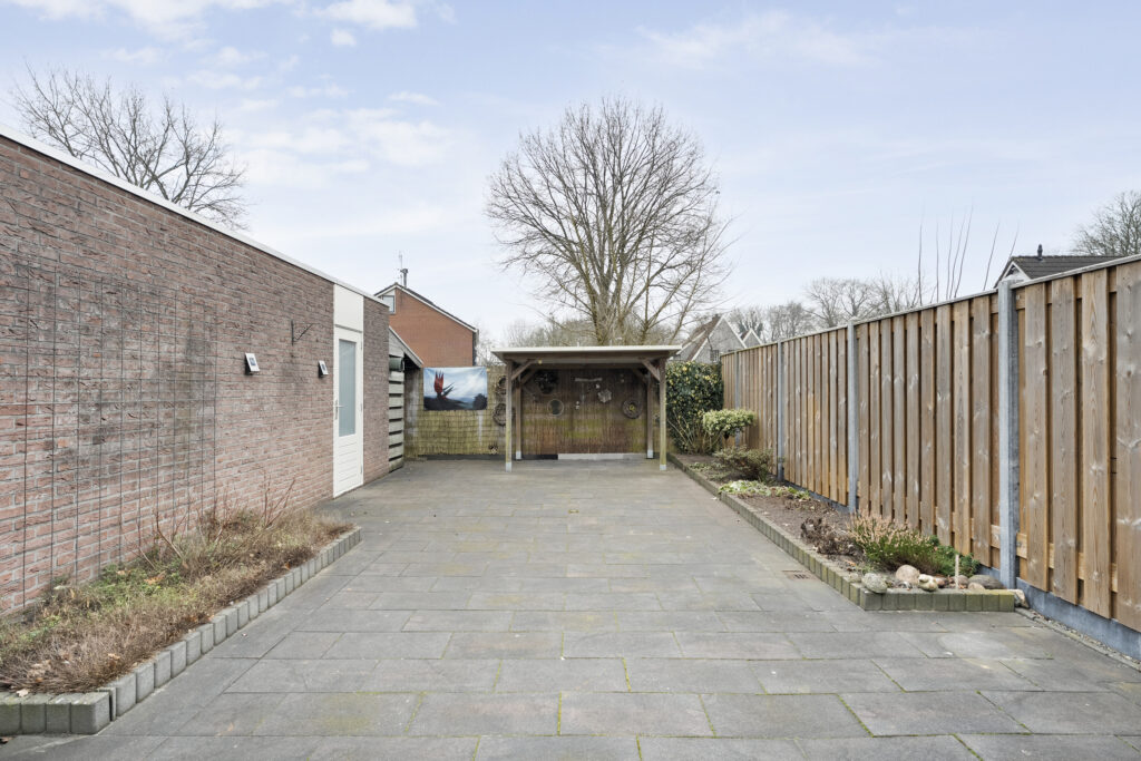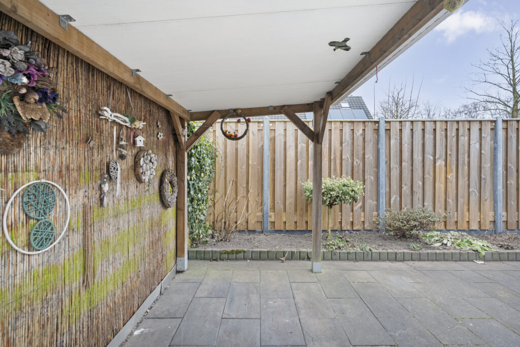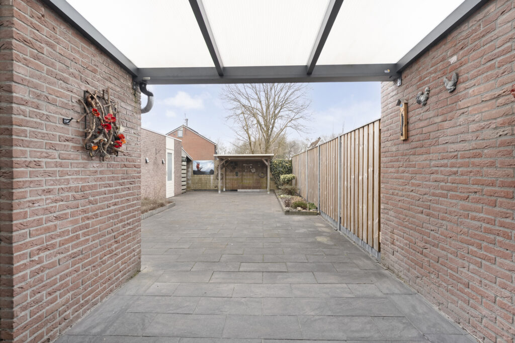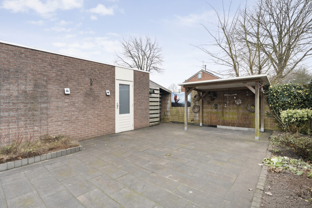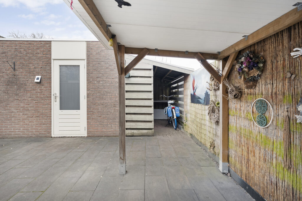 Buiten: Achtertuin op het zuiden met overkapping en fietsenberging. Via de achtertuin is de garage bereikbaar welke is voorzien van elektra een loopdeur en een kanteldeur. De aangebouwde carport is van 2019 en voorzien van inbouwspots.