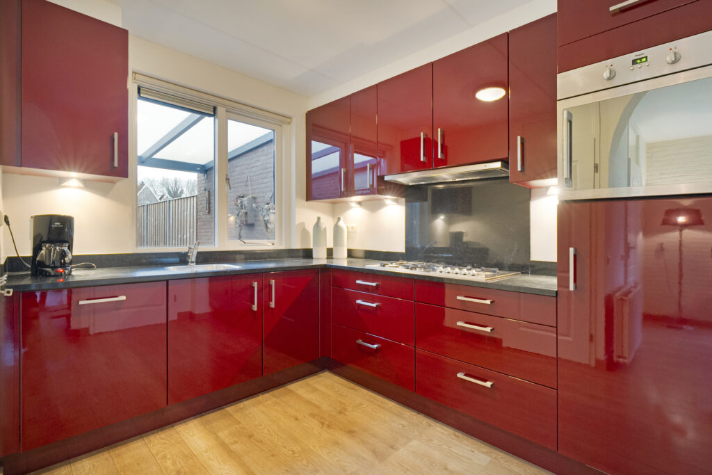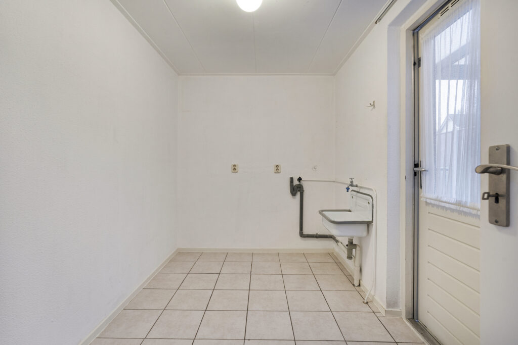 Begane grond: Entree/hal met meterkast, toilet en toegang tot de bijkeuken en de woonkamer. De woonkamer is voorzien van een laminaatvloer, deur met trapopgang naar de eerste verdieping en doorloop naar de half open keuken. De hoogglans donkerrode hoekkeuken is voorzien van een natuurstenen blad en inbouwapparatuur zoals een koelkast, vaatwasser, combi oven/magnetron en gaskookplaat met afzuigkap. In de keuken vind je nog 2 inbouwkasten, waarvan er één zeer ruim is. De bijkeuken is voorzien van witgoedaansluitingen, wateraansluiting met uitstortbak en deur naar de tuin met overkapping.