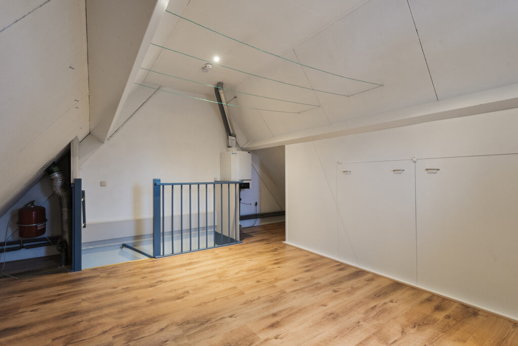 Zolder: Via vaste trap te bereiken open zolder. Overloop met CV installatie en bergruimte achter de knieschotten.