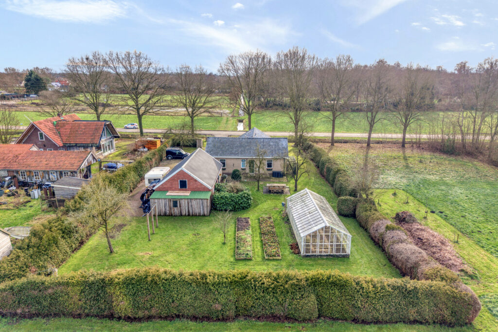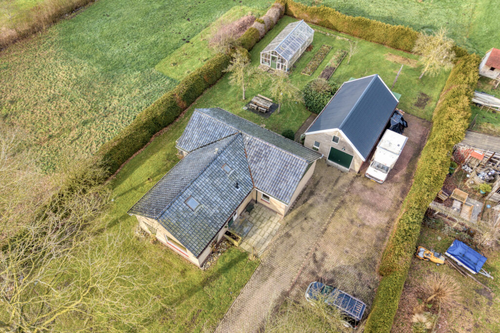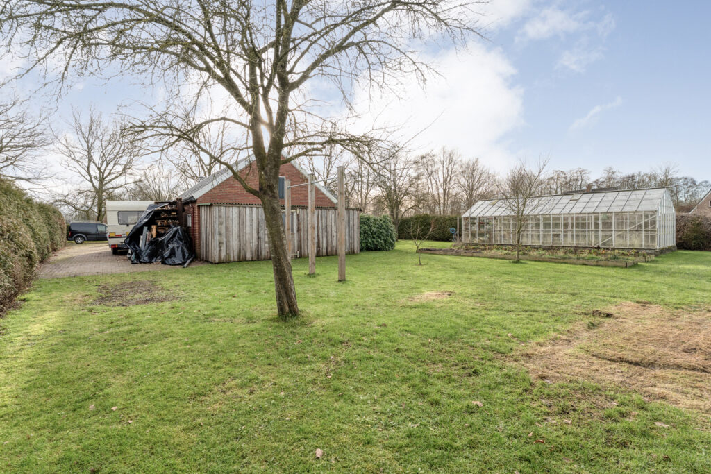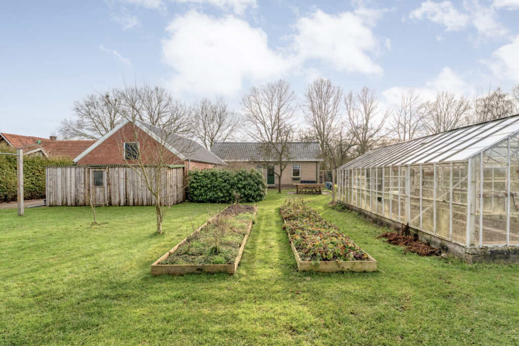 Buiten: Gelegen op een groot perceel met een vrijstaande stenen garage welke is voorzien van een kanteldeur, vliering, veel bergruimte en een (aardappel)kelder. In de achtertuin staat een grote kas, ideaal voor een tuinliefhebber met groene vingers! Het weiland leent zich uitstekend voor het houden van kleine dieren.