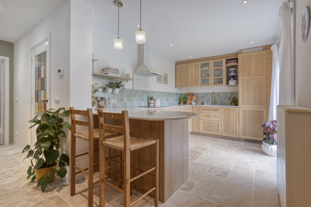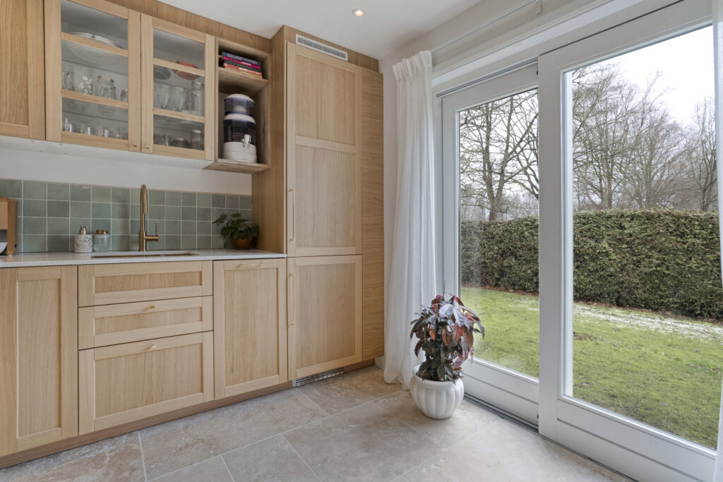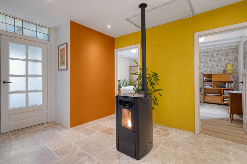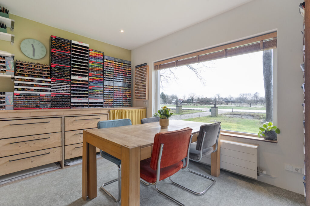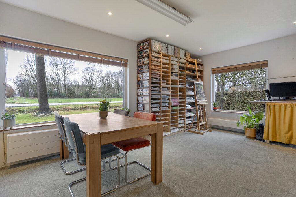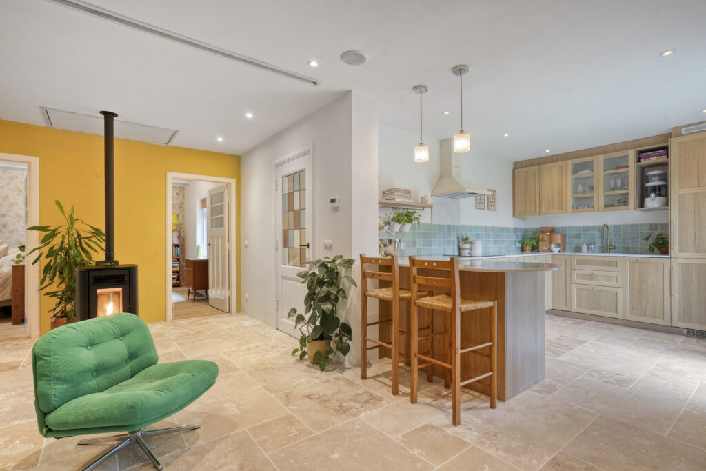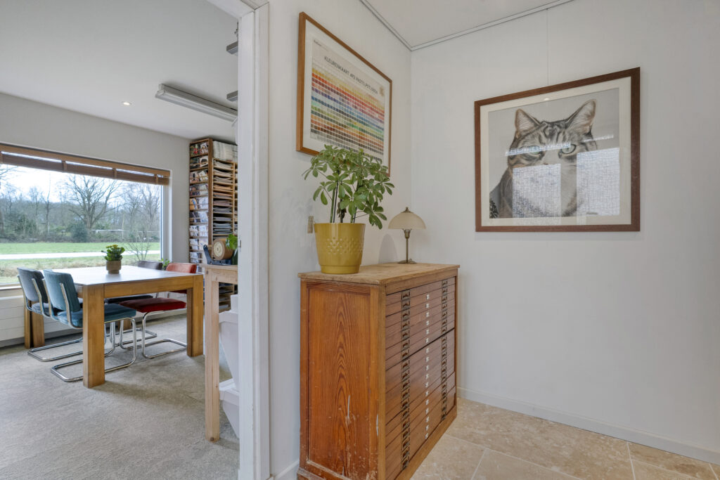 Begane grond: Entree / hal met toegang tot het toilet, de meterkast, bijkeuken met CV opstelling en witgoedaansluiting, de woonkeuken en de royale werkkamer. De werkkamer is gelegen aan de voorzijde van de woning en geeft prachtig vrij uitzicht over de landerijen. Vroeger was dit de woonkamer, uiteraard is dit weer zo in te delen. De woonkeuken wordt momenteel ook gebruikt als woonkamer en is voorzien van een sfeervolle pelletkachel, travertin plavuizen vloer met vloerverwarming en doorloop naar de open keuken. De keuken heeft een hoekopstelling met een schiereiland en is voorzien van inbouwapparatuur zoals een oven, vaatwasser, elektrische kookplaat met afzuigkap, spoelbak en koelkast met vriesvak.