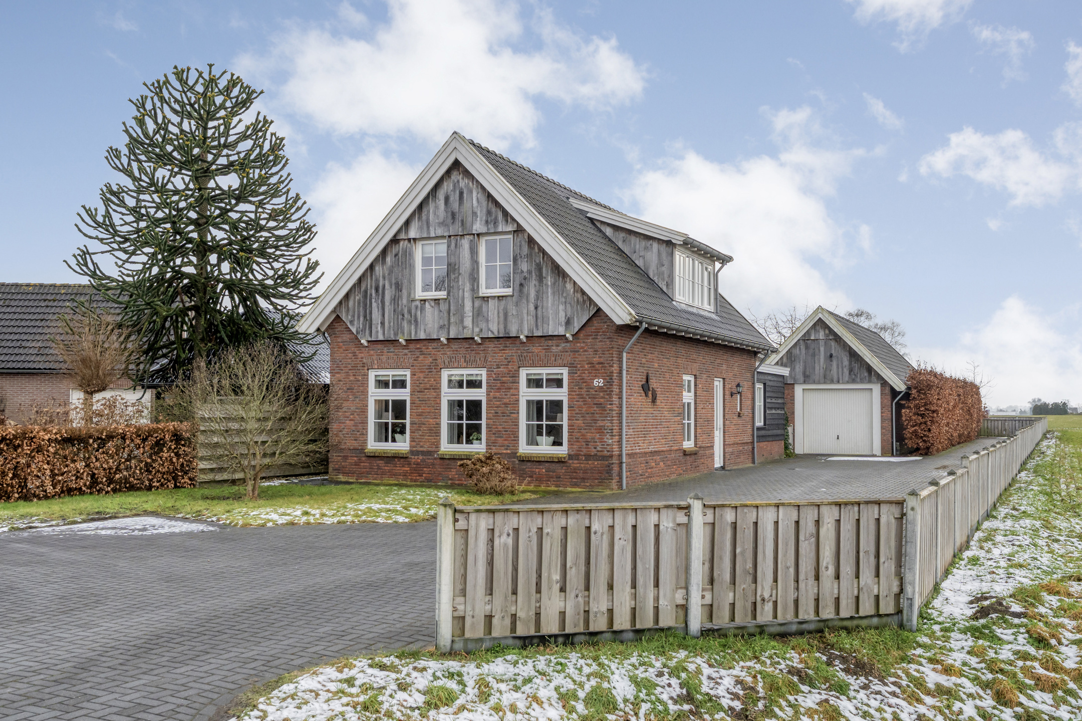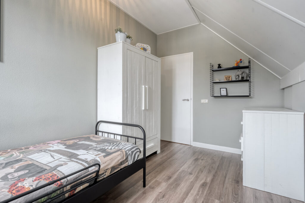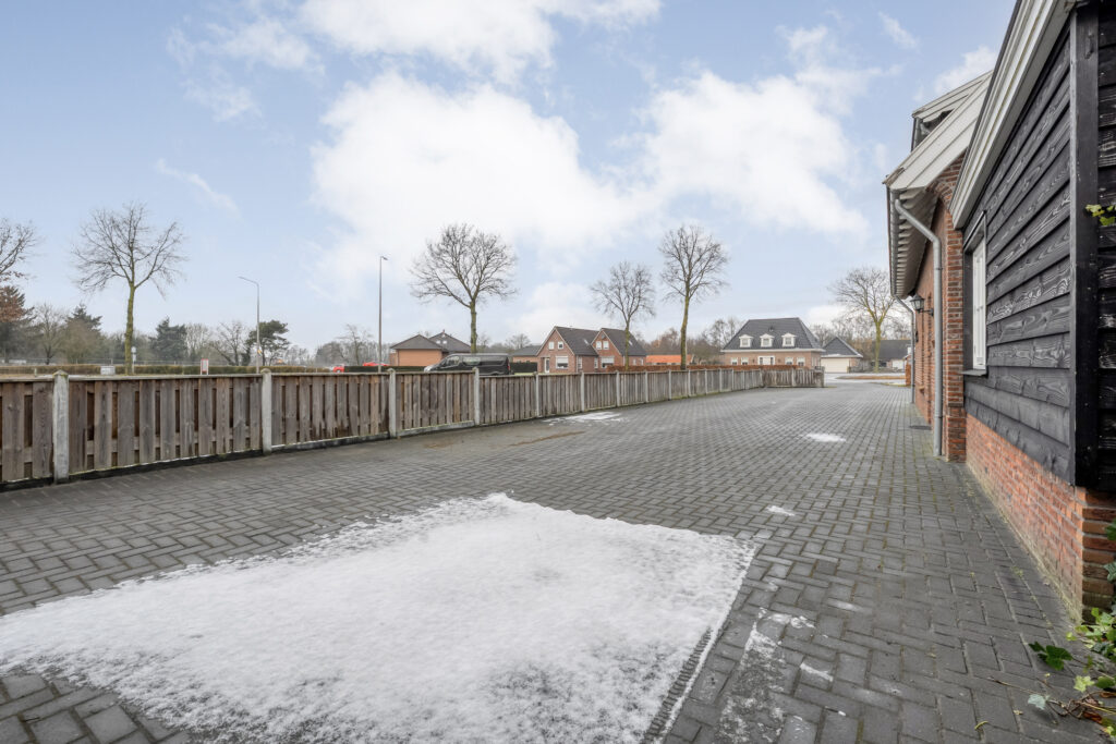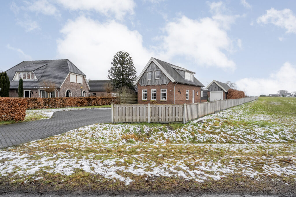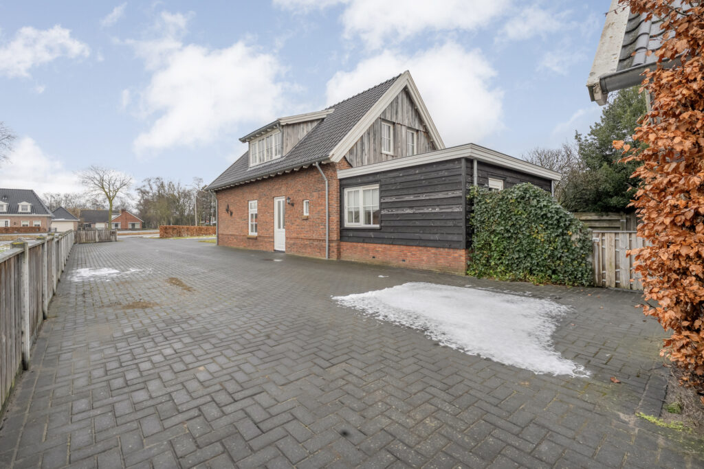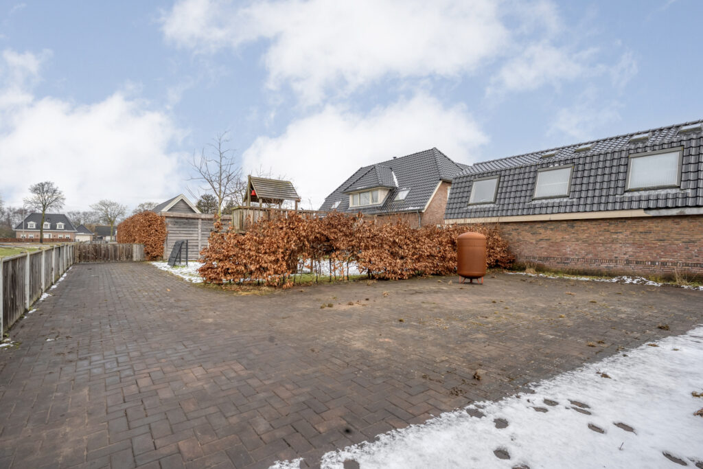 Buiten: Aan de voorzijde van de woning ligt een strak gazon met direct voor de woning diverse beplanting. Daarnaast ligt een lange oprit waar meerdere auto’s geparkeerd kunnen worden en aan het einde van de oprit bevindt zich de riante schuur met garage. Dit bijgebouw is over de gehele lengte voorzien van een ruime bergzolder.