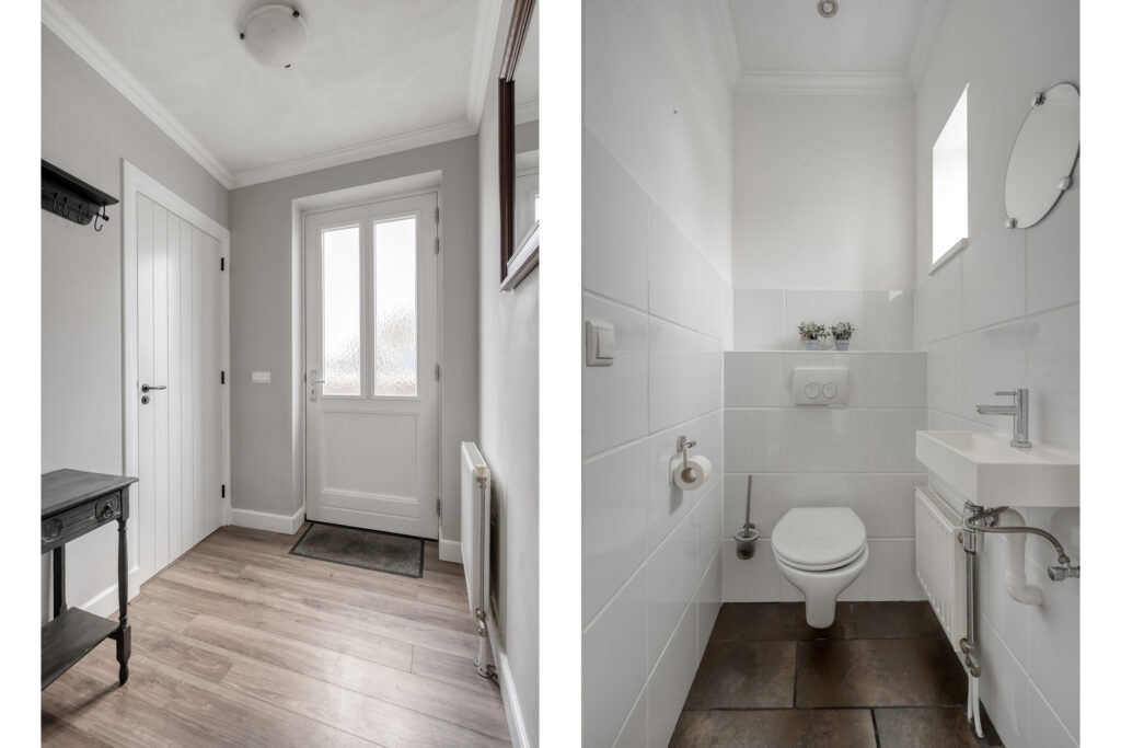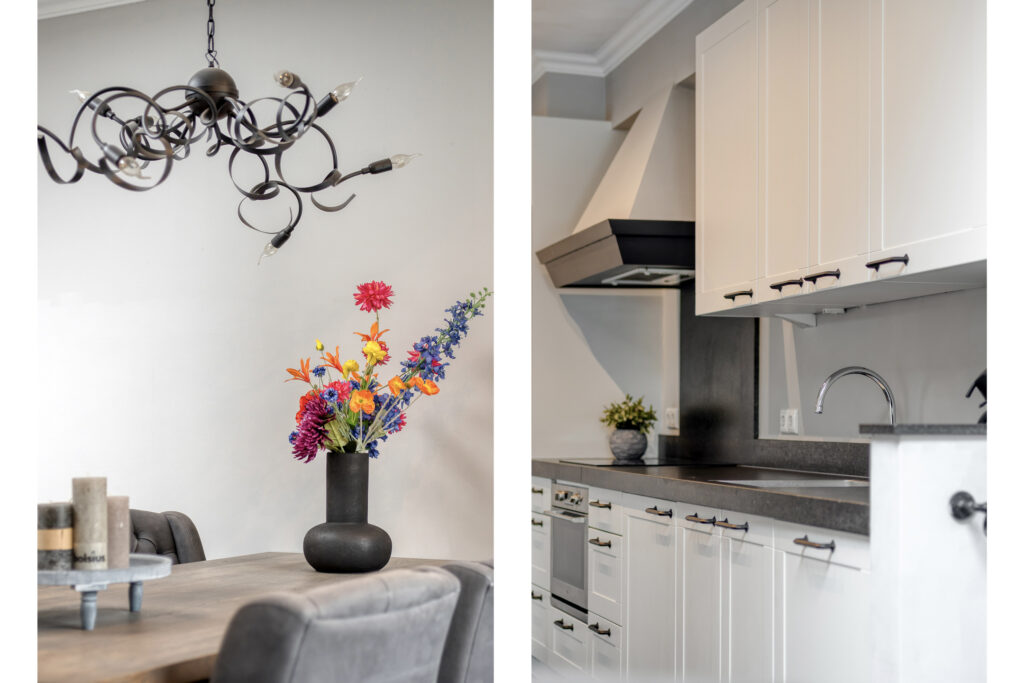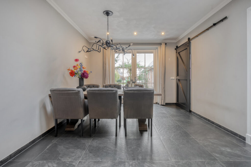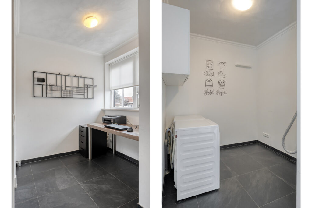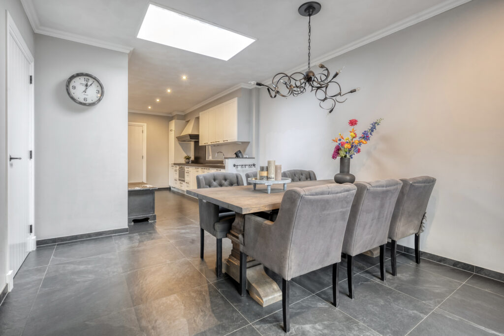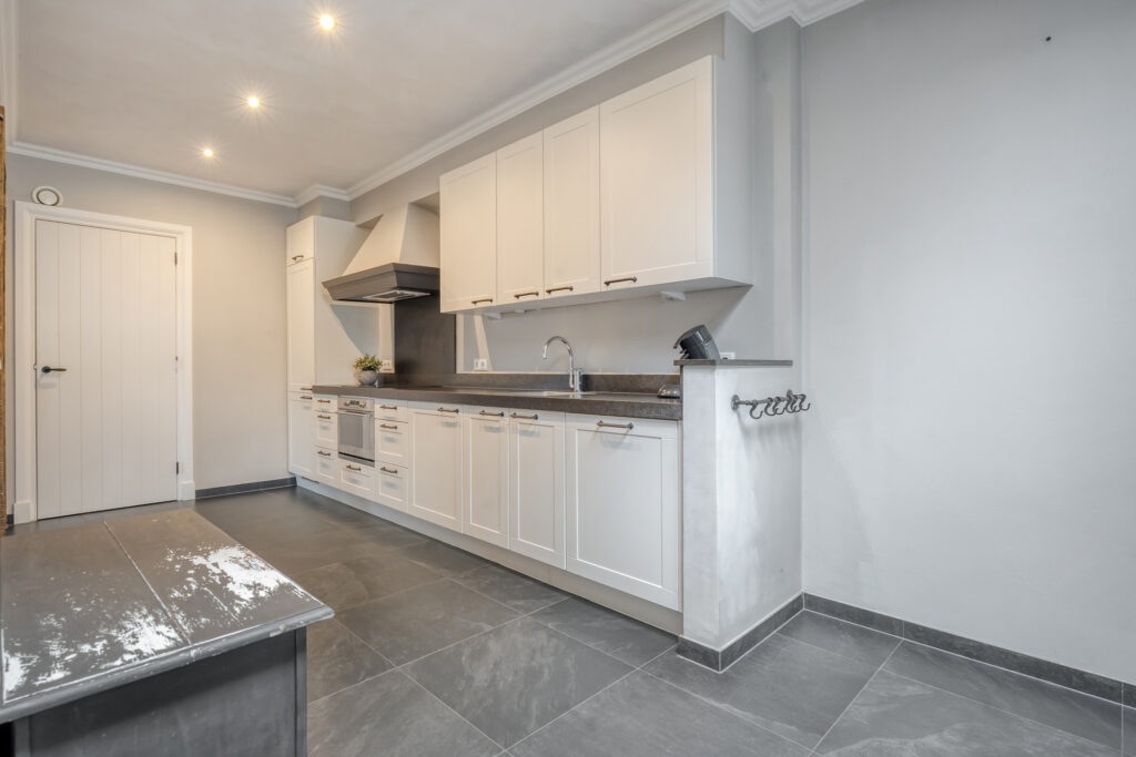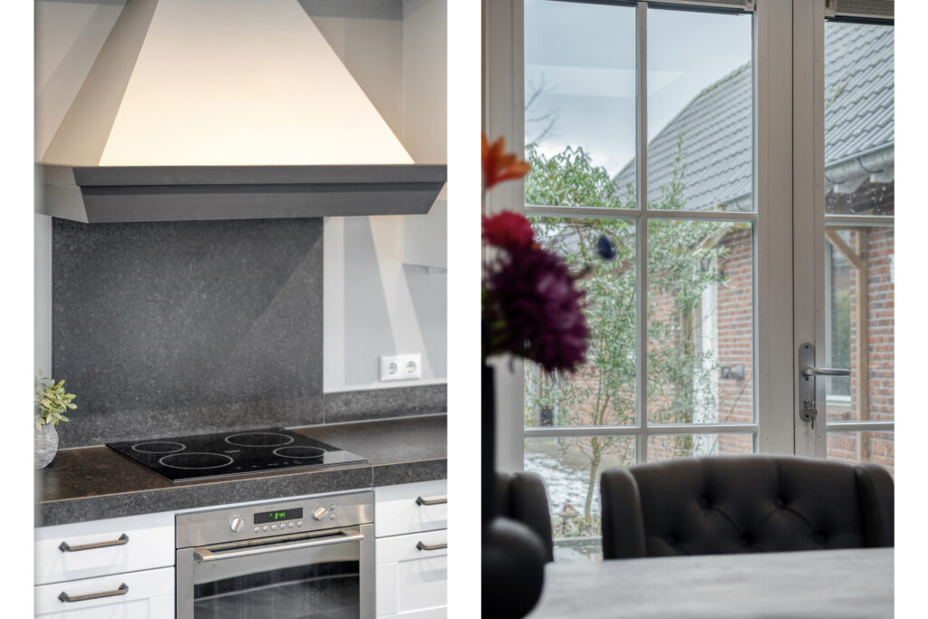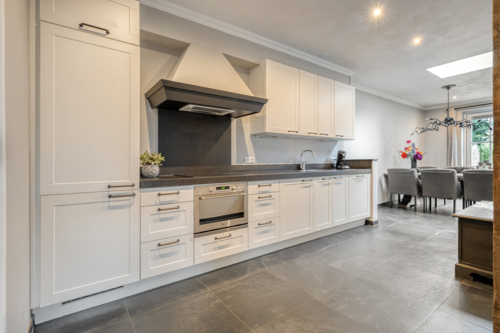 De halfopen woonkeuken beschikt over een rechte keukenopstelling met inductiekookplaat, combi-oven, koel-vriescombinatie en vaatwasmachine. Aan de achterzijde tref je het eetgedeelte aan, waar twee openslaande deuren toegang bieden tot het terras direct achter de woning. Verder biedt de keuken toegang tot een derde hal en een bijkeuken waar de witgoedaansluitingen en de meterkast zijn gesitueerd.