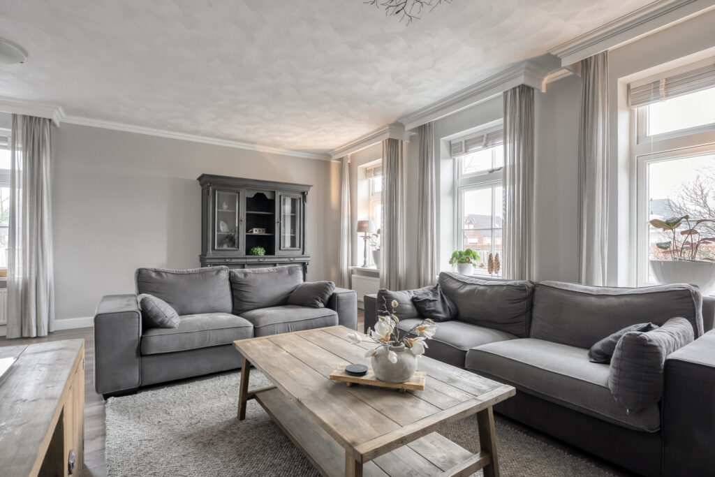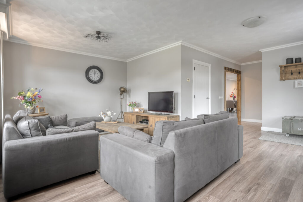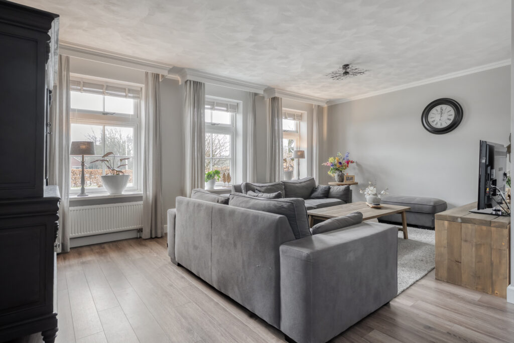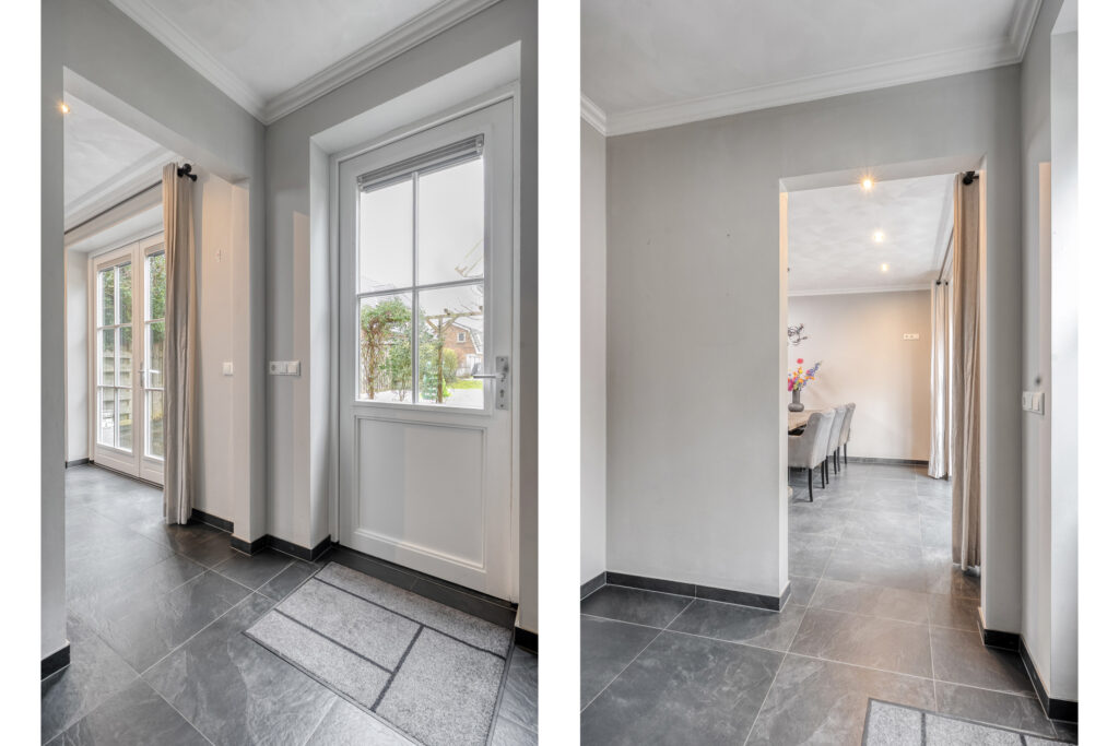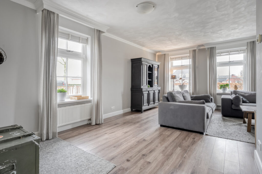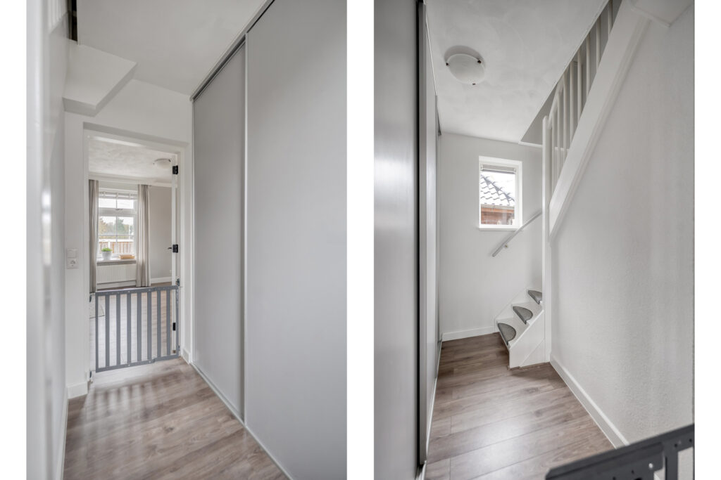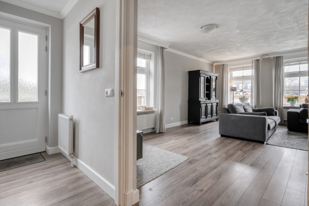 Begane grond: entree/hal aan de zijkant van de woning met het toilet met fonteintje. Vanuit de hal toegang tot de ruime woonkamer. Dankzij de grote raampartijen en de lichte plafond- en wandafwerking is de woonkamer heerlijk licht. De indeling biedt diverse mogelijkheden voor jouw gewenste inrichting. Vanuit de woonkamer is er toegang tot een tweede hal met vaste kast en de trapopgang naar de eerste verdieping. Middels een open doorgang is de ruime keuken te bereiken.