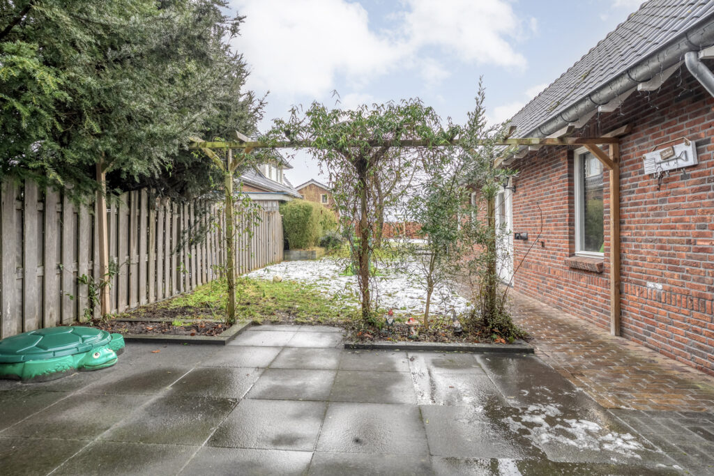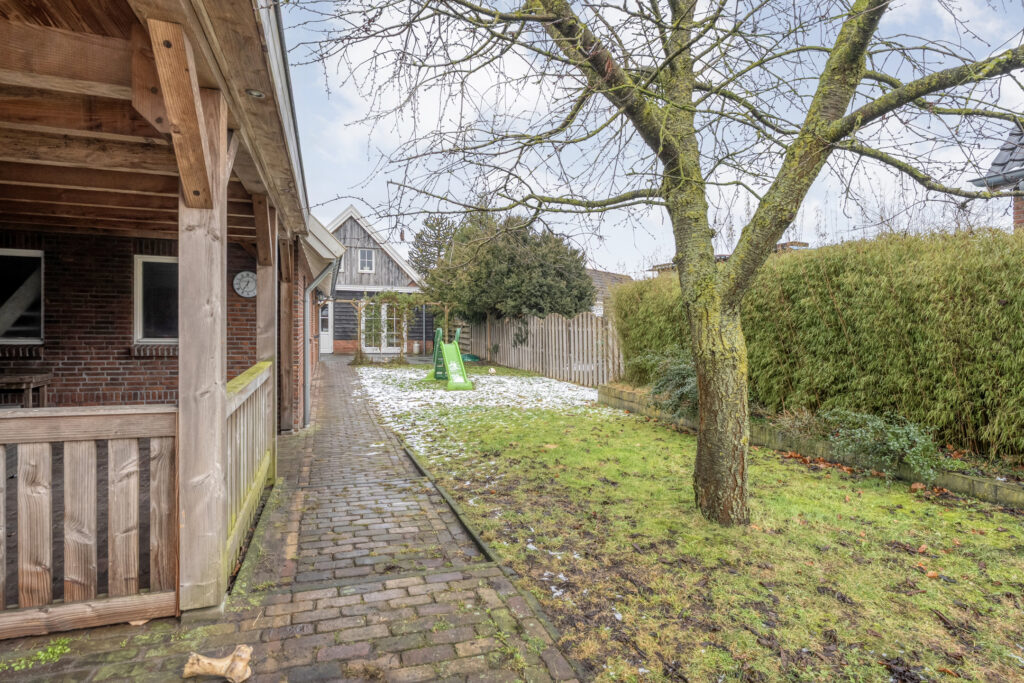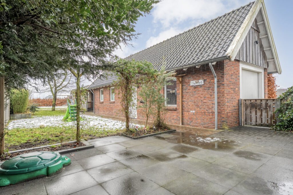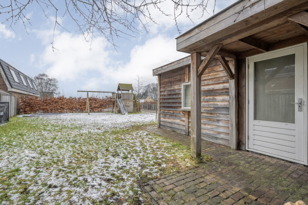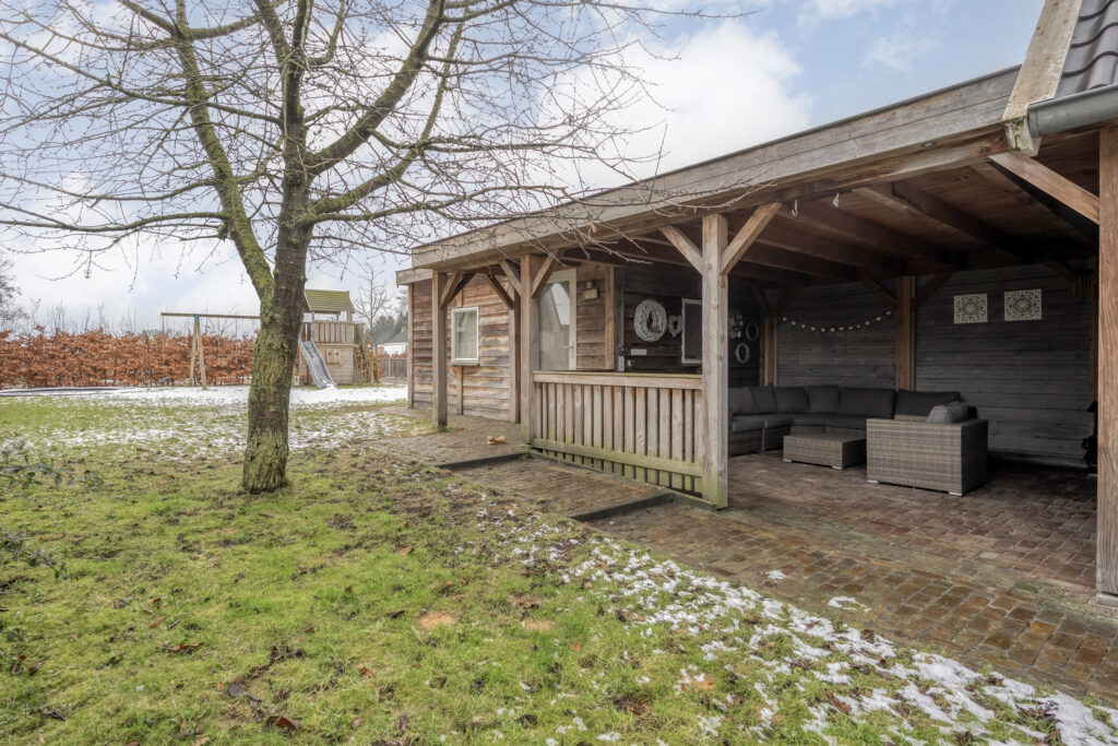 Direct achter de woning ligt een breed terras met een plantenborder en daarachter een groot gazon. In het verlengde van de schuur bevindt zich een tweede, houten berging met fraaie overkapping. Hier kun je heerlijk zitten!